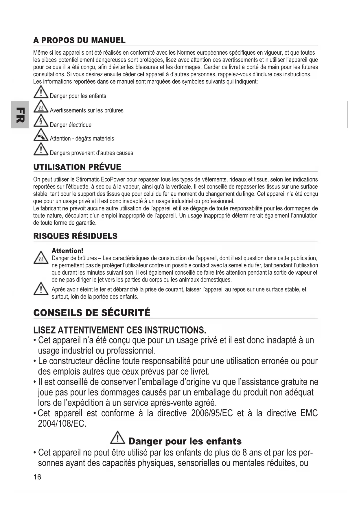 Même si les appareils ont été réalisés en conformité avec les Normes européennes spéciques en vigueur, et que toutes les pièces potentiellement dangereuses sont protégées, lisez avec attention ces avertissements et n’utiliser l’appareil que pour ce que il a été conçu, an d’éviter les blessures et les dommages. Garder ce livret à porté de main pour les futures consultations. Si vous désirez ensuite céder cet appareil à d’autres personnes, rappelez-vous d’inclure ces instructions. Les informations reportées dans ce manuel sont marquées des symboles suivants qui indiquent: Danger pour les enfants Avertissements sur les brûlures Danger électrique Attention - dégâts matériels Dangers provenant d’autres causes