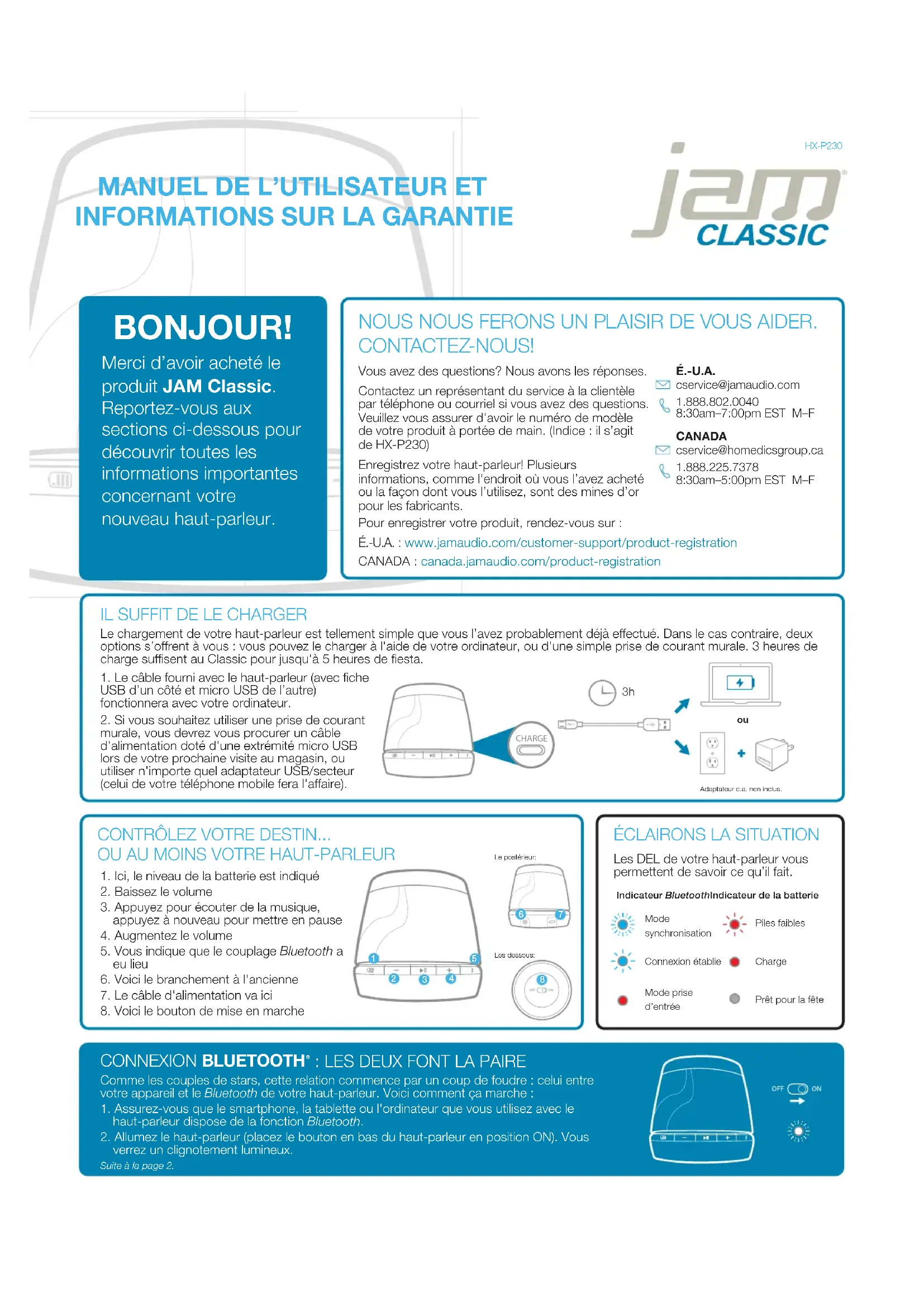 CHARGE Vous avez des questions? Nous avons les réponses. Contactez un représentant du service à la clientèle par téléphone ou courriel si vous avez des questions. Veuillez vous assurer d'avoir le numéro de modèle de votre produit à portée de main. (Indice : il s’agit de HX-P230)Enregistrez votre haut-parleur! Plusieurs informations, comme l'endroit où vous l’avez acheté ou la façon dont vous l’utilisez, sont des mines d’or pour les fabricants. Pour enregistrer votre produit, rendez-vous sur :É.-U.A. : www.jamaudio.com/customer-support/product-registrationCANADA : canada.jamaudio.com/product-registration É.-U.A. cservice@jamaudio.com