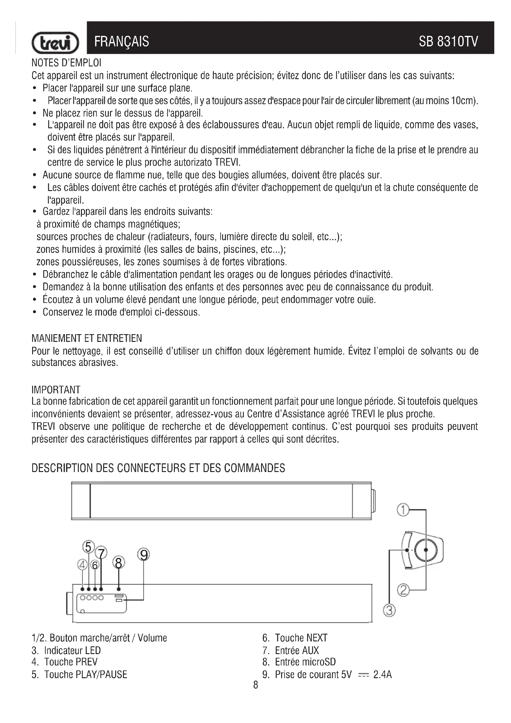 - Les câbles doivent être cachés et protégés afin d'éviter d'achoppement de quelqu'un et la chute conséquente de l'appareil.• Gardez l'appareil dans les endroits suivants: à proximité de champs magnétiques; sources proches de chaleur (radiateurs, fours, lumière directe du soleil, etc...); zones humides à proximité (les salles de bains, piscines, etc...); zones poussiéreuses, les zones soumises à de fortes vibrations.• Débranchez le câble d'alimentation pendant les orages ou de longues périodes d'inactivité.• Demandez à la bonne utilisation des enfants et des personnes avec peu de connaissance du produit.• Écoutez à un volume élevé pendant une longue période, peut endommager votre ouïe.• Conservez le mode d'emploi ci-dessous.MANIEMENT ET ENTRETIENPour le nettoyage, il est conseillé d’utiliser un chiffon doux légèrement humide. Évitez l’emploi de solvants ou de substances abrasives.IMPORTANTLa bonne fabrication de cet appareil garantit un fonctionnement parfait pour une longue période. Si toutefois quelques inconvénients devaient se présenter, adressez-vous au Centre d’Assistance agréé TREVI le plus proche.TREVI observe une politique de recherche et de développement continus. C’est pourquoi ses produits peuvent présenter des caractéristiques différentes par rapport à celles qui sont décrites.DESCRIPTION DES CONNECTEURS ET DES COMMANDES1/2. Bouton marche/arrêt / Volume3. Indicateur LED4. Touche PREV5. Touche PLAY/PAUSE6. Touche NEXT7. Entrée AUX8. Entrée microSD9. Prise de courant 5V 2.4A