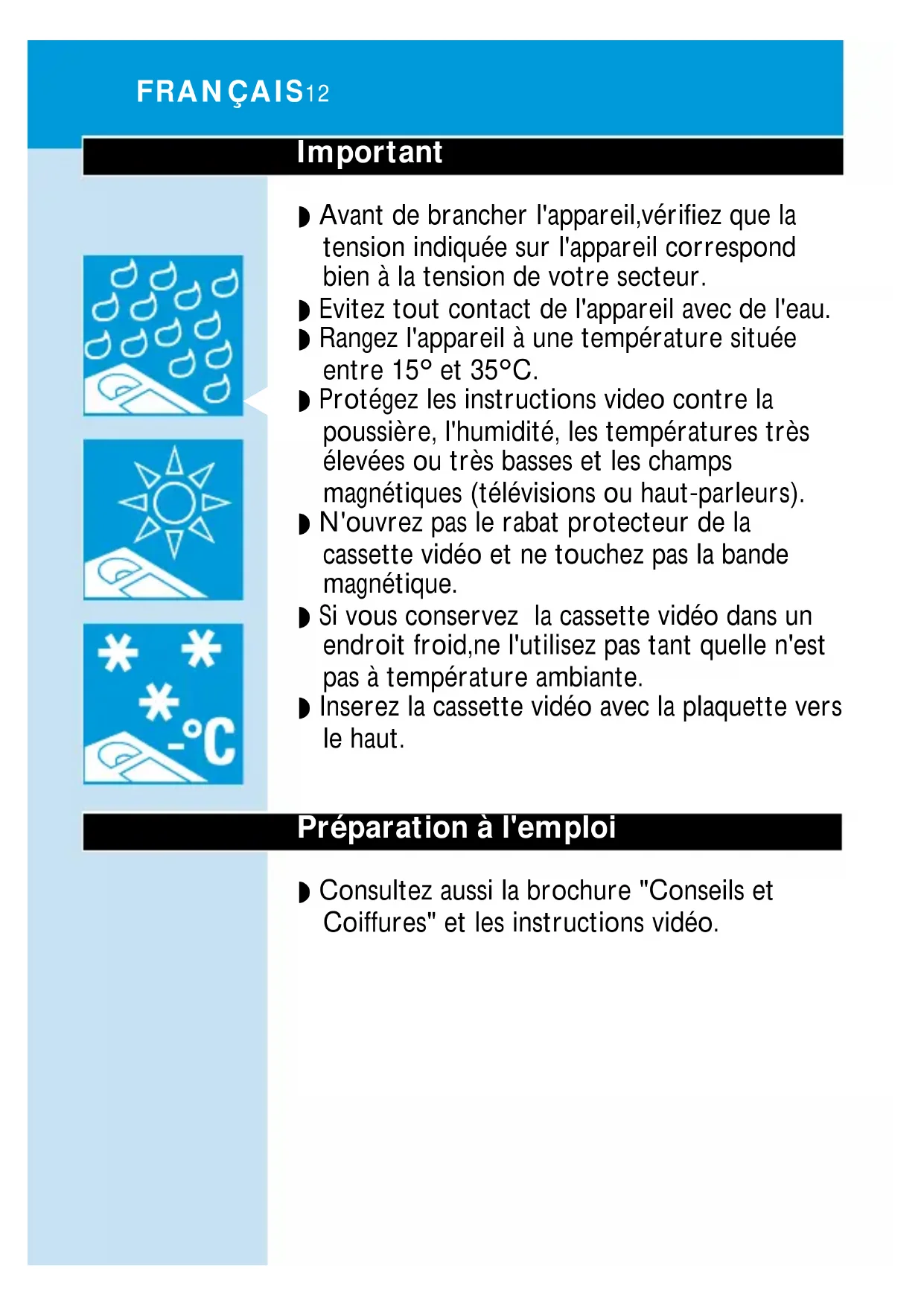 Si vous conservez la cassette video dans un endroit froid, ne l'utilisez pas tant qu'elle n'est pas à température ambiente.