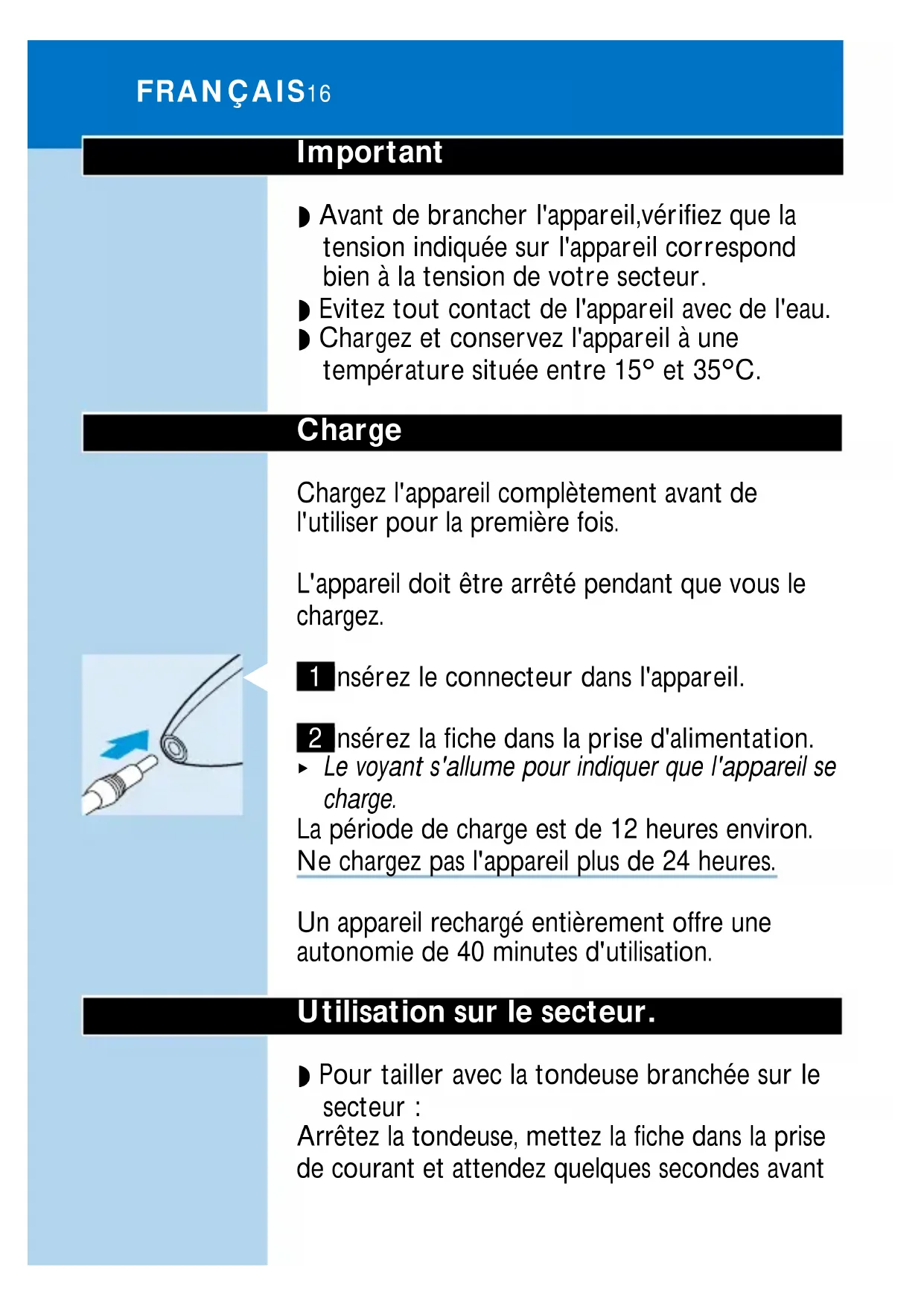 Le voyant s'allume pour indiquer que l'appareil se charge. La période de charge est de 12 heures environ. Ne chargez pas l'appareil plus de 24 heures. Un appareil rechargé entièrement offre une autonomie de 40 minutes d'utilisation. Utilisation sur le secteur. ◗ Pour tailler avec la tondeuse branchée sur le secteur : Arrêtez la tondeuse, mettez la fiche dans la prise de courant et attendez quelques secondes avant FRANÇAIS16de la mettre en marche. Si les accumulateurs sont complètement déchargés : attendez quelques minutes avant de mettre l'appareil en marche. L'appareil ne doit pas fonctionner branché sur le secteur quand les accumulateurs sont complètement chargés. Préparation à l'emploi ◗ Consultez aussi la brochure "Conseils et Coiffures". Taille avec guide de coupe: 1 Choissez le guide de coupe petit ou grand, en fonction de la longueur de coupe désirée (voir table).