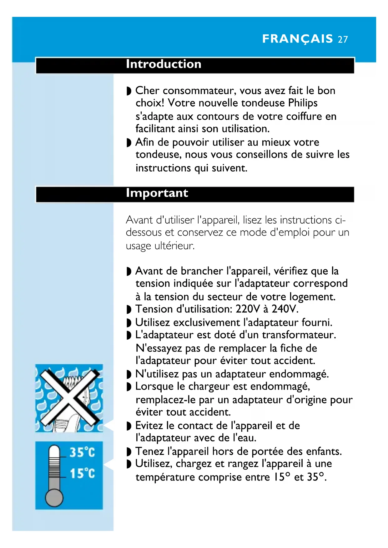 6 Ziehen Sie den Akku aus dem Gerät. Entsorgen Sie den Akku und die anderen Komponenten in umweltverträglicher Weise. DEUTSCH 25Nach Entnahme des Akkus darf das Gerät nicht mehr am Netz betrieben werden! Garantie und Kundendienst Benötigen Sie weitere Informationen oder treten Probleme auf, wenden Sie sich bitte an Ihren Philips-Händler oder setzen Sie sich mit einem Philips Service-Center in Ihrem Land in Verbindung (Tel. Nr. 0180/5356767). Besuchen Sie auch die Philips Website www.philips.com DEUTSCH26Introduction ◗ Cher consommateur, vous avez fait le bon choix! Votre nouvelle tondeuse Philips s'adapte aux contours de votre coiffure en facilitant ainsi son utilisation. ◗ Afin de pouvoir utiliser au mieux votre tondeuse, nous vous conseillons de suivre les instructions qui suivent. Important Avant d'utiliser l'appareil, lisez les instructions ci- dessous et conservez ce mode d'emploi pour un usage ultérieur. ◗ Avant de brancher l'appareil, vérifiez que la tension indiquée sur l'adaptateur correspond à la tension du secteur de votre logement. ◗ Tension d'utilisation: 220V à 240V. ◗ Utilisez exclusivement l'adaptateur fourni. ◗ L'adaptateur est doté d'un transformateur. N'essayez pas de remplacer la fiche de l'adaptateur pour éviter tout accident. ◗ N'utilisez pas un adaptateur endommagé. ◗ Lorsque le chargeur est endommagé, remplacez-le par un adaptateur d'origine pour éviter tout accident.
