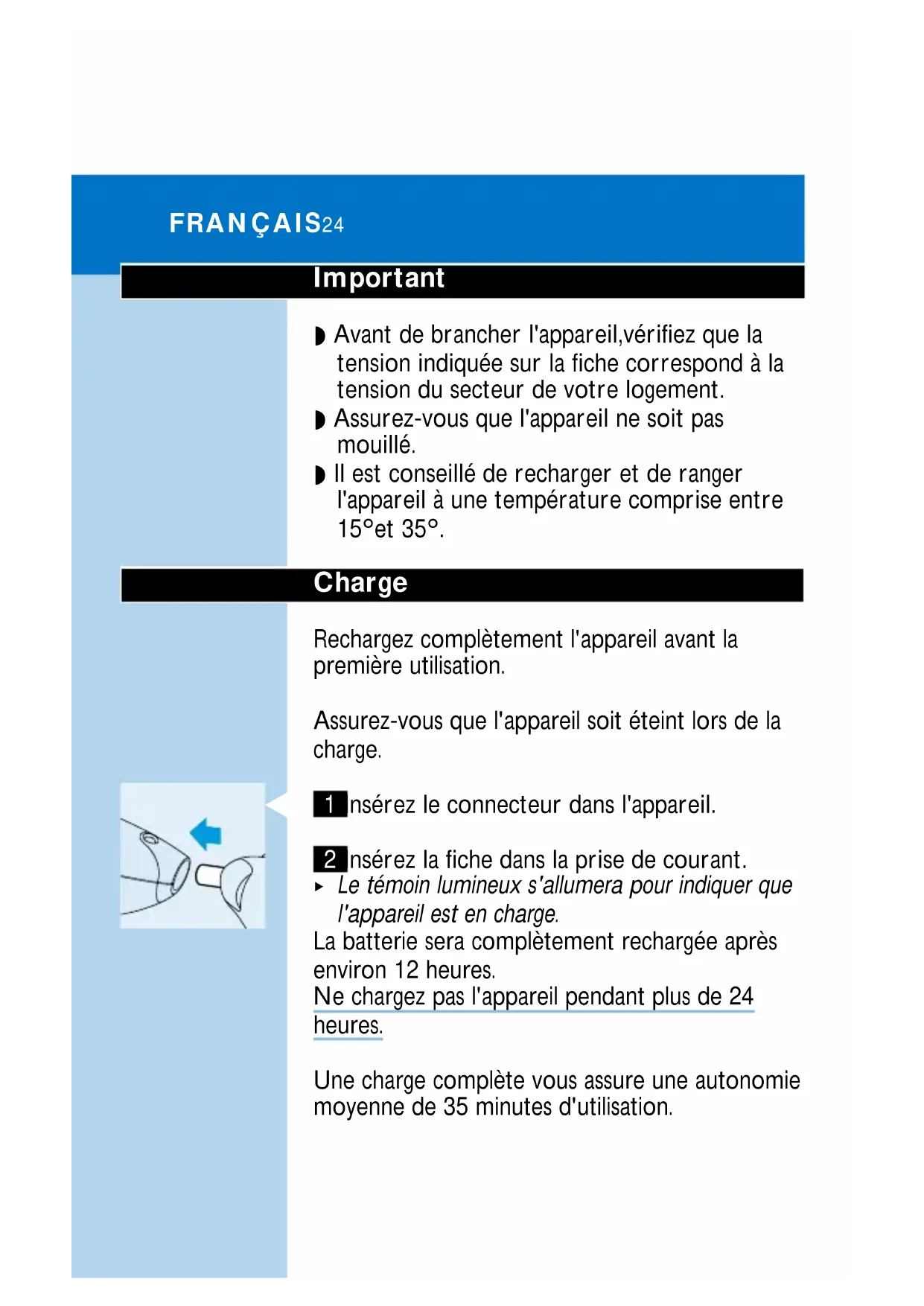 7 Trennen Sie mit dem Schraubendreher den Akku von dem Kunststoffteil. 8 Entsorgen Sie den Akku in der oben geschilderten, gesetzlich vorgeschriebenen Weise. Wenn der Akku entfernt worden ist, darf das Gerät nicht mehr am Netz betrieben werden! Die Telefonnummern des Philips Service Centres entnehmen Sie bitte der beiliegenden Garantieschrift. DEUTSCH 23Important ◗ Avant de brancher l'appareil,vérifiez que la tension indiquée sur la fiche correspond à la tension du secteur de votre logement. ◗ Assurez-vous que l'appareil ne soit pas mouillé. ◗ Il est conseillé de recharger et de ranger l'appareil à une température comprise entre 15c et 35c. Charge Rechargez complètement l'appareil avant la première utilisation. Assurez-vous que l'appareil soit éteint lors de la charge.