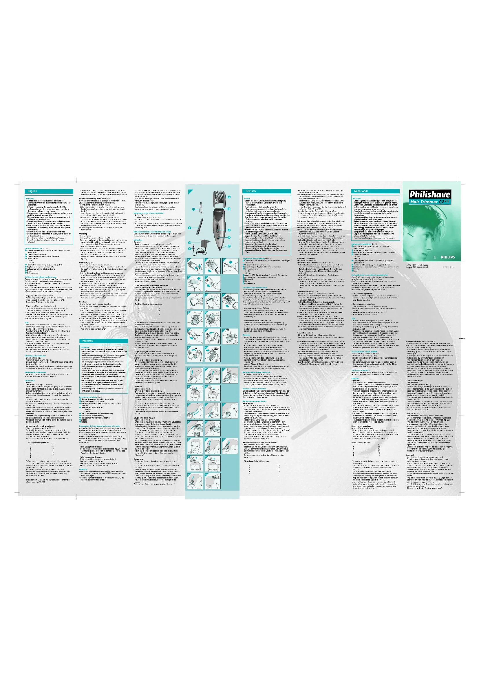 - Avant de couper, coiffez les cheveux de façon à ce qu’ils tombent naturellement. - En général, il est préférable de commencer par le cou et d’aller vers le haut de la tête. Ensuite coupez les cheveux de devant et sur le sommet de la tête (fig. 17). Tenez le côté plat du guide de coupe dirigé vers la tête. Déplacez-le lentement vers le haut, coupez une petite quantité de cheveux à la fois. Procédez la même manière sur les côtés et à l’arrière de la tête (fig. 18, 19). - Si vous désirez couper les cheveux des cotés ou de derrière, plus courts que ceux du dessus, changez la hauteur de coupe. Coupe au peigne ou avec doigts Si vous voulez couper les cheveux à une longueur supérieure à 17 mm, vous pouvez utiliser la “coupe au peigne”. - Enlevez le guide de coupe (fig. 3). - Prenez une petite mèche de cheveux à la fois avec un peigne (fig. 20) ou pincez-la avec vos doigts (fig. 21). Déplacez le peigne ou les doigts le long de la mèche jusqu’à la longueur souhaitée. - Coupez les cheveux à partir du peigne ou des doigts. Continuez de cette façon en partant du devant jusqu’à l’arrière de la tête. Vous pouvez ainsi progressivement couper les cheveux de plus en plus court. Vérifiez la longueur de coupe régulièrement. - Coiffez fréquemment pour enlever cheveux coupés et vérifiez d’éventuelles inégalités. Contours - Coiffez les cheveux. - Enlevez le guide de coupe (fig. 3). - Pour égaliser la base du cou coupez les cheveux comme indiqué dans le fig. 22, en maintenant la tondeuse dans la position inverse et légèrement contre le poil (fig. 23). - Procédez de la même manière pour tailler les favoris (fig. 24). - Pour couper le poil près des oreilles placez un coin seulement de la tête de coupe sur le poil. Assurez-vous que les dents de la tondeuse sont à bonne distance des oreilles (fig. 25). Lentement et soigneusement formez le contour désiré (fig. 26). Coupe en brosse (fig. 27) - Coiffez les cheveux. - Choisissez la hauteur de coupe 7 (maximum). Coupez les cheveux en partant de l’arrière du cou (fig. 28). - Taillez les côtés, faites des coupes en partant du bord vers le centre (fig. 29), par exemple, parallèles aux côtés de la tête. Maintenez la tête de rasage tout contre la tête. Bougez la tondeuse lentement sur les cheveux. - Si vous le désirez vous pouvez couper les cheveux sur le cou et les côtés une seconde fois, en utilisant une position plus basse (ex: 3 ou 4). - Pour une coupe à ras, coupez les cheveux sur le sommet de la tête à l’aide d’un peigne ou des doigts (fig. 30, 31) et en utilisant la tondeuse à cheveux sans le guide de coupe. Référez-vous également au paragraphe “Coupe au peigne ou avec les doigts”. - Terminez la coupe en rectifiant les bords du cou et des favoris. Référez-vous également au paragraphe “Contours”. Coupe rase - Coiffez les cheveux dans le sens de la pousse des cheveux. - Choisissez la longueur de cheveux désirée pour l’arrière et les côtés. - Taillez ensuite en faisant des coupes du bord vers le centre (fig. 32). Maintenez la tête de rasage tout contre la tête. Bougez la tondeuse lentement sur les cheveux. - Choisissez la longueur de cheveux désirée pour le haut de la tête (fig. 33). Taillez en procédant de la même façon. - Pour les contours utilisez la tondeuse sans guide de coupe. Référez-vous également au paragraphe “Contours”. Allgemeine Beschreibung (Abb. 1) A Kamm-Aufsatz, abnehmbar. Verschiedenen Haarlängen anpaßbar. B Schneide-Einheit, abnehmbar. C Schnittlängen-Regler, drücken und schieben. D Ein-/Ausschalter I = Ein O = Aus E Anschluß für Gerätestecker, Niedervolt Gleichstrom. F Gerätestecker, Niedervolt Gleichstrom. G Netzgerät H Bürste I Frisierkamm Vorbereitung zum Gebrauch Je nach dem gewünschten Haarschnitt können Sie das Gerät mit oder ohne Kamm-Aufsatz verwenden. Der Kamm-Aufsatz kann auf sieben verschiedene Haarschnitt-Längen eingestellt werden. Sie können die Schnittlänge einstellen, indem Sie den Regler (C) verschieben, während Sie die Arretierung auf dem Regler gedrückt halten. Die Schnittlänge ist eingestellt, sobald Sie die Arretierung loslassen.