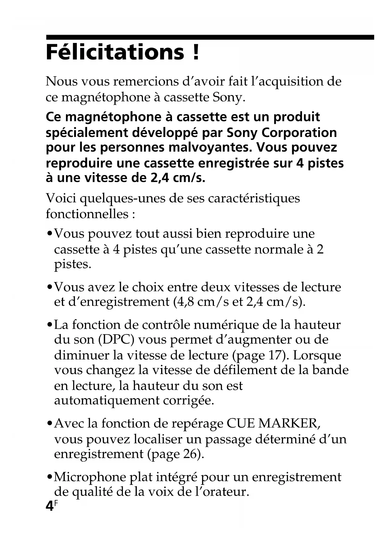 Félicitations ! Nous vous remercions d’avoir fait l’acquisition de ce magnétophone à cassette Sony. Ce magnétophone à cassette est un produit spécialement développé par Sony Corporation pour les personnes malvoyantes. Vous pouvez reproduire une cassette enregistrée sur 4 pistes à une vitesse de 2,4 cm/s. Voici quelques-unes de ses caractéristiques fonctionnelles :
