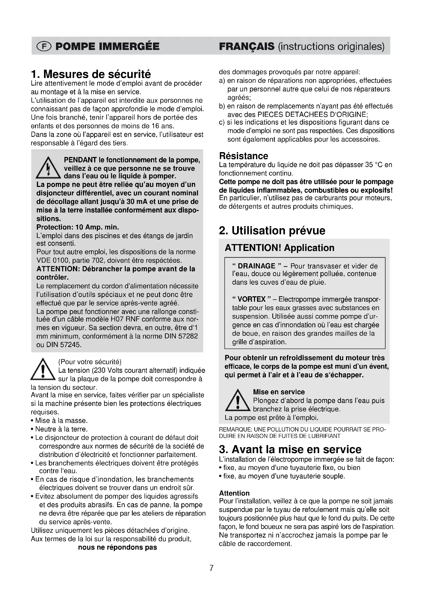 ATTENTION! Application “ DRAINAGE ” – Pour transvaser et vider de l’eau, douce ou légèrement polluée, contenue dans les cuves d’eau de pluie. “ VORTEX ” – Electropompe immergée transpor- table pour les eaux grasses avec substances en suspension. Utilisée aussi comme pompe d’ur- gence en cas d’innondation où l’eau est chargée de boue, en raison des grandes mailles de la grille d’aspiration. Pour obtenir un refroidissement du moteur très efficace, le corps de la pompe est muni d’un évent, qui permet à l’air et à l’eau de s‘échapper. Mise en service Plongez d’abord la pompe dans l’eau puis branchez la prise électrique. La pompe est prête à l’emploi.