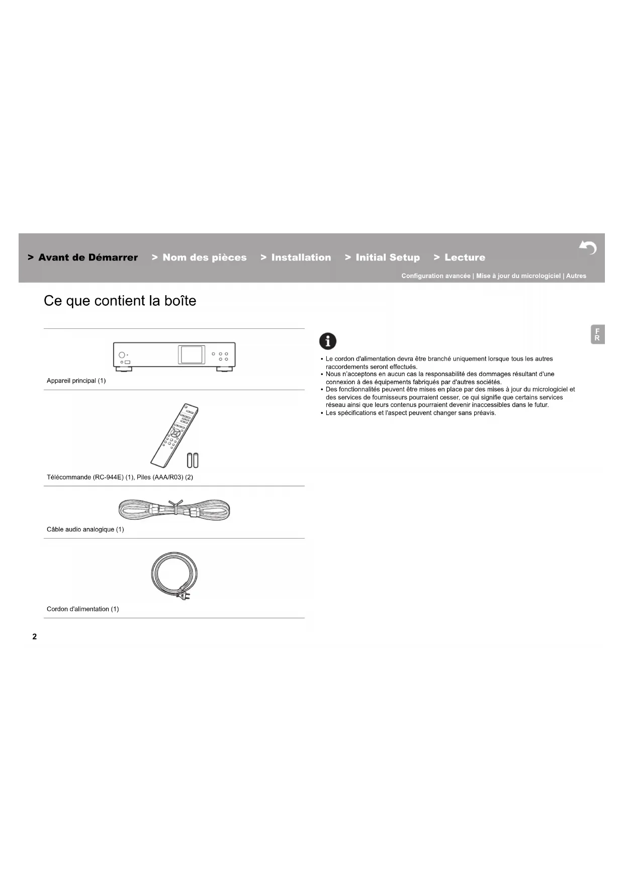 Ce que contient la boîte Avant de Démarrer 0 Le cordon d'alimentation devra être branché uniquement lorsque tous les autres raccordements seront effectués. 0 Nous n’acceptons en aucun cas la responsabilité des dommages résultant d'une connexion à des équipements fabriqués par d'autres sociétés. 0 Des fonctionnalités peuvent être mises en place par des mises à jour du micrologiciel et des services de fournisseurs pourraient cesser, ce qui signifie que certains services réseau ainsi que leurs contenus pourraient devenir inaccessibles dans le futur. 0 Les spécifications et l'aspect peuvent changer sans préavis. Appareil principal (1) Télécommande (RC-944E) (1), Piles (AAA/R03) (2) Câble audio analogique (1) Cordon d'alimentation (1)> Avant de Démarrer > Nom des pièces > Installation > Initial Setup > Lecture Configuration avancée | Mise à jour du micrologiciel | Autres