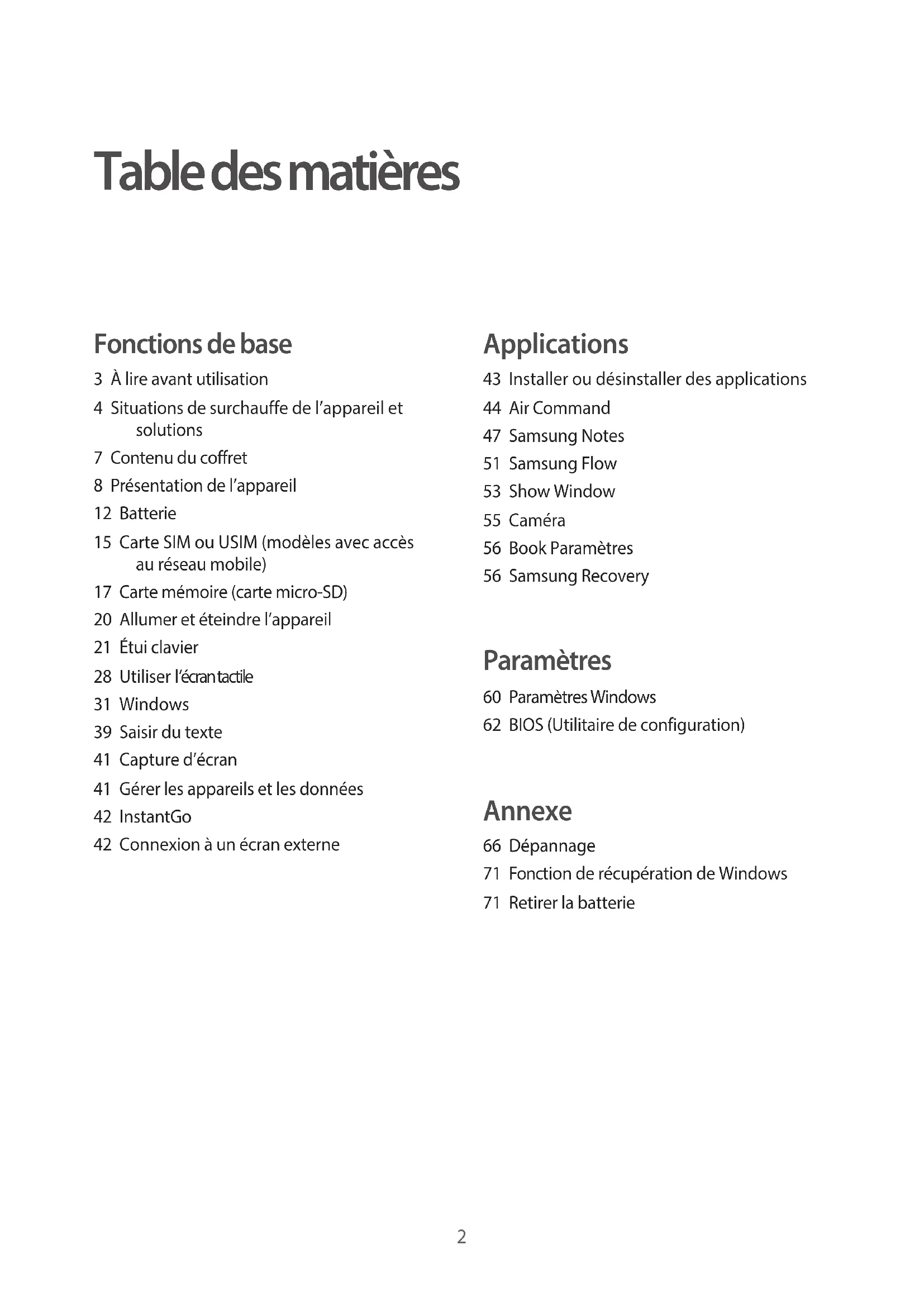 www.samsung.com Mode d'emploi French. 06/2017. Rev.1.0 SM-W720 SM-W727 SM-W7282 Table des matières Fonctions de base 3 À lire avant utilisation 4 Situations de surchauffe de l’appareil et solutions 7 Contenu du coffret 8 Présentation de l’appareil 12 Batterie 15 Carte SIM ou USIM (modèles avec accès au réseau mobile) 17 Carte mémoire (carte micro-SD) 20 Allumer et éteindre l’appareil 21 Étui clavier 28 Utiliser l’écran tactile 31 Windows 39 Saisir du texte 41 Capture d’écran 41 Gérer les appareils et les données 42 InstantGo 42 Connexion à un écran externe Applications 43 Installer ou désinstaller des applications 44 Air Command 47 Samsung Notes 51 Samsung Flow 53 Show Window 55 Caméra 56 Book Paramètres 56 Samsung Recovery Paramètres 60 Paramètres Windows 62 BIOS (Utilitaire de configuration) Annexe 66 Dépannage 71 Fonction de récupération de Windows 71 Retirer la batterie3 Fonctions de base À lire avant utilisation Veuillez lire attentivement ce mode d’emploi, afin de pouvoir utiliser votre appareil correctement et en toute sécurité.