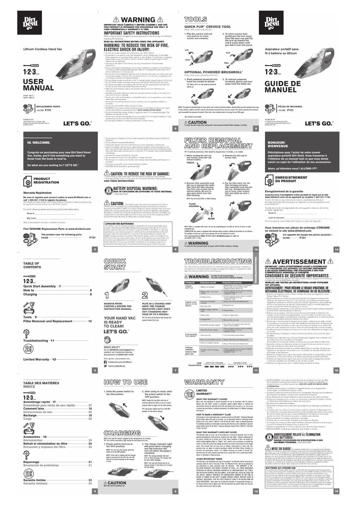 LIMITÉE GARANTIECOUVERTURE DE LA GARANTIEVotre appareil Dirt Devil est garanti contre les défauts de fabrication et de main d'oeuvre s'il est utilisé à des fins domestiques normales et conformément au manuel du propriétaire. Pendant la Période de garantie, nous fournirons la main-d’œuvre et les pièces gratuitement afin de corriger une telle défectuosité pour les produits achetés aux États-Unis, dans les boutiques d’échanges militaires américaines et au Canada. RÉCLAMATION AU TITRE DE LA GARANTIESi le produit n’est pas dans l’état prévu par la garantie, apportez ou envoyez le produit à un centre de réparations autorisé Dirt Devil avec une preuve d’achat. Pour obtenir la liste des points de service autorisés aux É.-U., composez le numéro du service automatisé au 1 800 321-1134 OU visitez Dirt Devil en ligne à l'adresse www.DirtDevil.com Pour obtenir du soutien ou d'autres renseignements au sujet de la garantie ou pour connaître les boutiques offrant les réparations au titre de la garantie, appelez le Centre de réponses à la clientèle Dirt Devil au numéro 1 800 321-1134, du lundi au vendredi, de 8 h à 19 h, HND. ÉLÉMENTS NON COUVERTS PAR LA GARANTIECette garantie ne couvre pas : l'utilisation du produit à des fins commerciales (comme par les femmes de chambre, les concierges et les services de location d'équipement), le rouleau de brosses, la courroie, les sacs, les filtres, un entretien inadéquat du produit, les bris causés par la mauvaise utilisation, les cas fortuits et autres actes hors du contrôle de la Royal Appliance Mfg. Co. (« Royal », « nous »), les agissements ou omissions du propriétaire, l'utilisation à l'extérieur du pays d'achat et de reventes d'origine du produit par le premier acheteur. La présente garantie ne couvre pas le ramassage, la livraison, le transport, ni les réparations à domicile. Cette garantie ne s’applique pas aux produits achetés en dehors des États-Unis, y compris ses territoires et possessions, en dehors d’une boutique d’échanges militaires américaine et à l’extérieur du Canada. Cette garantie ne couvre pas les produits achetés à une partie n'étant pas un détaillant, concessionnaire ou distributeur autorisé des produits Royal.AUTRES CONDITIONS IMPORTANTESLa présente garantie n’est pas transférable et ne peut pas être cédée. La présente garantie sera régie et interprétée selon les lois de l’État de l’Ohio. La période de garantie ne sera pas prolongée après tout remplacement ou toute réparation au titre de la présente garantie. CETTE GARANTIE EST VOTRE SEUL RECOURS ET VOIE DE DROIT FOURNIS PAR ROYAL. TOUTES AUTRES GARANTIES, EXPRESSES OU TACITES, INCLUANT LES GARANTIES DE QUALITÉ MARCHANDE OU D'ADAPTATION À UN USAGE PARTICULIER, SONT DÉCLINÉES. EN AUCUN TEMPS, ROYAL NE POURRA ÊTRE TENUE RESPONSABLE DE TOUS LES DOMMAGES-INTÉRÊTS SPÉCIAUX, INDIRECTS, ACCIDENTELS OU ACCESSOIRES D'AUCUNE SORTE OU D'AUCUNE NATURE ENVERS LE PROPRIÉTAIRE OU DE TOUTES PARTIES RÉCLAMANT AU NOM DU PROPRIÉTAIRE, QUE CE SOIT PAR CONTRAT, NÉGLIGENCE, TORT OU RESPONSABILITÉ STRICTE DES PRODUITS OU SURVENUS PAR QUELQUE CAUSE QUE CE SOIT. Certains États ne permettent pas l’exclusion des dommages consécutifs. Par conséquent, l’exclusion précédente pourrait ne pas être applicable dans votre cas. La présente garantie vous donne des droits précis. Vous pouvez également avoir d’autres droits, lesquels varient d’une province à l'autre.Para reducir el riesgo de lesiones de piezas móviles, retire el cepillo giratorio antes de limpiarlo o realizarle un servicio de mantenimiento. PRECAUCIÓN TIRERPIVOTERVOLTEEEMPUJEPIVOTERPOUSSER TIRE VOLTEEALOJAMIENTO DEL FILTROFILTROPRESIONESUR LE LOGEMENT DU FILTREFILTREAPPUYEZNOTA: El cepillo giratorio accionado tiene su propio motor y un dispositivo de protección del motor: si la suciedad atasca al cepillo giratorio y evita que gire, apague la unidad, quite el cepillo giratorio accionado de la unidad, quite la suciedad del cepillo giratorio y vuelva ensamblar el accesorio del cepillo giratorio accionado en la unidad. Luego espere algunos minutos antes de volver a encender la unidad.REMARQUE : Le rouleau-brosse est actionné par son propre moteur doté d’un dispositif de protection. Si des débris obstruent le rouleau-brosse ou l’empêchent de tourner, éteignez l’appareil, retirez le rouleau-brosse à action autonome de l’appareil, retirez les débris obstruant le rouleau-brosse et réinstallez ce dernier sur l’appareil. Attendez ensuite quelques minutes avant d’allumer l’appareil.*No es estándar en todos los modelos*Pas de série sur tous les modèles 1. Retournez le suceur plat vers l’extérieur et le pousser pour nettoyer les fissures et crevasses.1. Poussez rouleau-brosse dans la buse de l’aspirateur portatif pour le fixer. 2. Tirez doucement sur la buse motorisée pour la retirer de l’asirateur portatif.2. Pour ranger le suceur plat : tirez doucement l’accessoire pour le retirer du vide-poussière et faites-le pivoter vers le haut de l’appareil, puis poussez-le jusqu’à ce qu’il soit bien en place.SUCEUR PLAT QUICK FLIP™Nettoyez facilement les fentes et les fissures.REMARQUE : Videz le vide-poussière après chaque utilisation ou lorsqu’il est plein. Vérifiez si le filtre doit être nettoyé. Référez-vous à la page n° 20 pour les détails concernant le filtre.CONSEIL : L’interrupteur doit être à la position OFF (arrêt) pour que l’appareil se recharge. 2. Lorsque vous n’utilisez plus l’appareil, faites glisser l’interrupteur à la position OFF (arrêt).1. Faites glisser l’interrupteur à la position ON (marche).