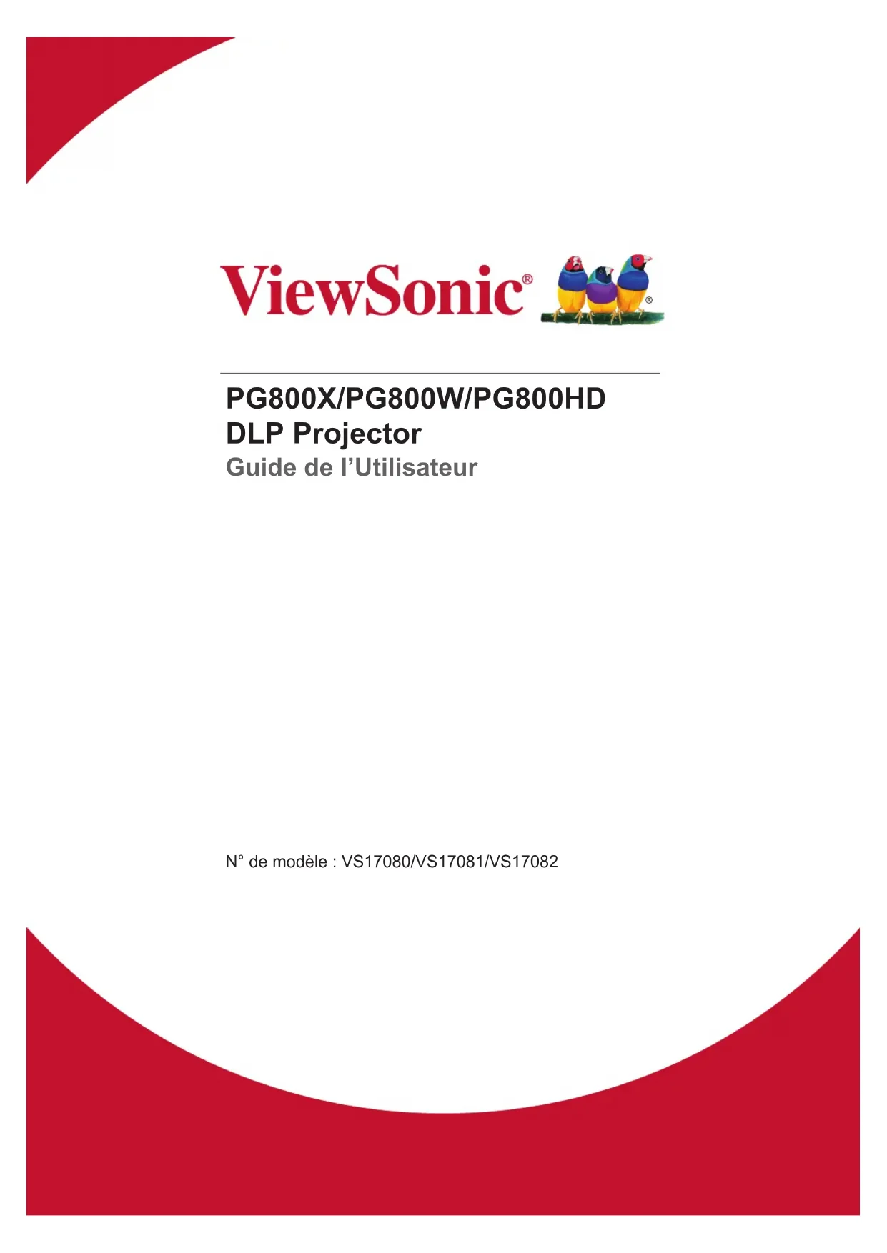PG800X/PG800W/PG800HD DLP Projector Guide de l’Utilisateur N° de modèle : VS17080/VS17081/VS17082Conformité FCC Ce périphérique est conforme avec la partie 15 des règles FCC, à savoir les deux règles suivantes : (1) ce périphérique ne cause pas d’interférence nocive (2) ce péri- phérique doit accepter toute interférence reçue, y comprises celles pouvant causer des défaillances. Cet équipement a été testé et a été déclaré conforme dans les limites d’un péri- phérique numérique de Classe B, conformément à la partie 15 des règles FCC. Ces limites sont conçues pour établir des protections raisonnables contre les interférenc- es nocives dans une installation domestique. Cet équipement génère, use et peut émettre des ondes dur des fréquences radio et, si non installé et utilisé conformé- ment aux instructions, peut causer des interférences avec les communications radio. Cependant, il n’est pas garanti qu’une interférence ne puisse arriver au sein d’une installation particulière. Si cet équipement cause des interférences avec la réception radio ou télévision, ce qui peut être déterminé en allumant/éteignant l’équipement, l’utilisateur est encouragé à essayer de résoudre le problème en essayant ces différentes mesures : y Changer l’orientation ou la position de l’antenne de réception. y Augmenter la distance entre l’équipement et le récepteur. y Connecter l’équipement dans une prise située sur un circuit différent de celui du récepteur. y Consulter le vendeur ou un technicien qualié radio/TV. Attention : Tout changement ou modication qui n’est pas expressément approu- vée par un tiers non responsable de la mise en conformité peut annuler votre droit d’utiliser l’équipement. Pour le Canada y Cet appareil numérique Classe B est conforme avec la norme canadienne ICES-003. y Cet appareil numérique de la classe B est conforme à la norme NMB-003 du Canada. Conformité CE pour les pays européens. Cet appareil est conforme avec la Directive de l’EMC 2014/30/EU et la Directive Basses Tensions 2014/35/EU. Les informations suivantes sont seulement à destination des Etats membres de l’UE : La marque est conforme avec la Directive 2012/19/EU (WEEE : Waste Elec- trical and Electronic Equipment). La marque recommande de ne PAS jeter l’équipement, incluant des batter- ies ou accumulateurs usagés, en tant qu’ordure ménagère non triée. Utilisez plutôt le système disponible de retour et de collecte. Si les batteries, accumulateurs et piles boutons incluses dans cet équipe- ment afches les Hg, Cd ou Pb, cela signie que la batterie contient a une conteneur en métaux lourds de plus de 0,0005% en Mercure ou plus de 0,002% en Cadmium ou encore plus de 0,004% en Plomb. iInformations importantes liées à la sécurité