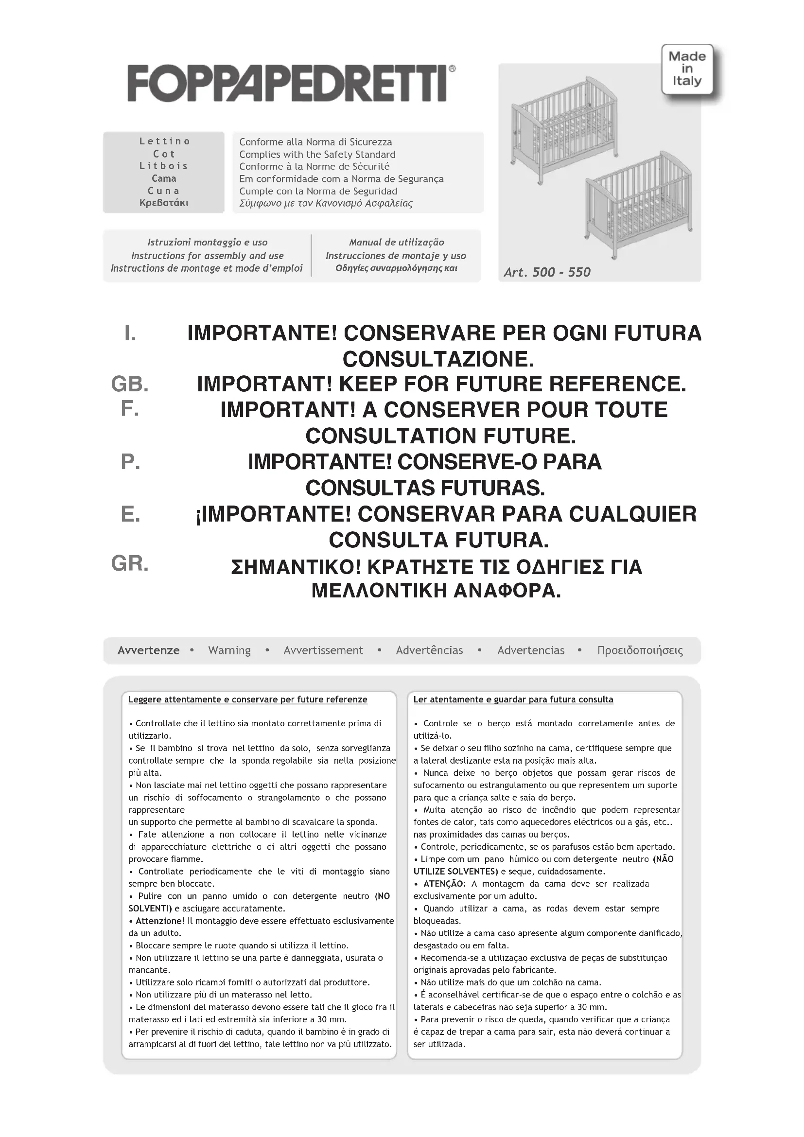 Lettino Teddy Love 500 - Lit bébé Foppapedretti - Notice d'utilisation et mode d'emploi gratuit