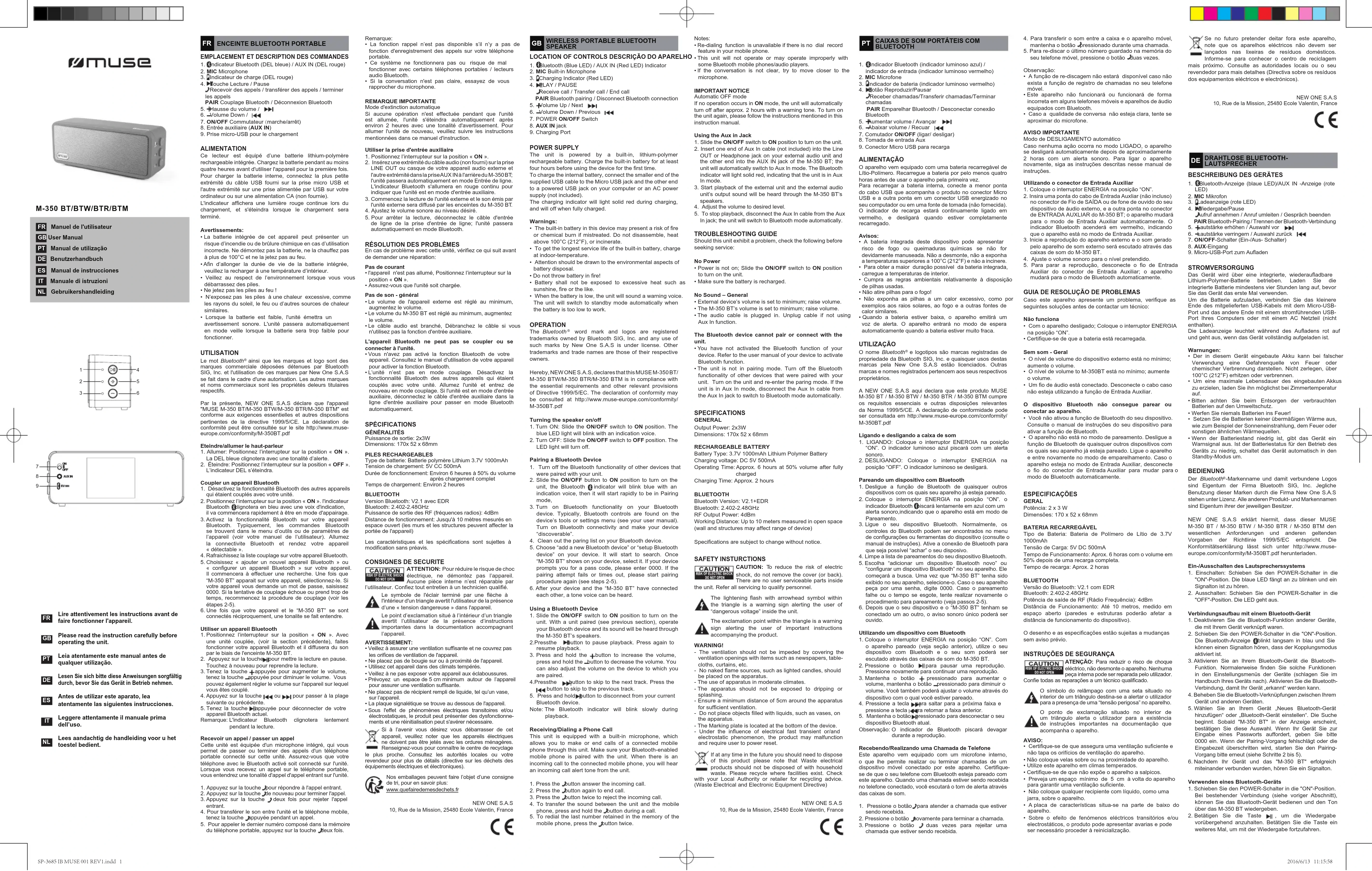 miteinander verbunden wurden, hören Sie ein Signalton.Verwenden eines Bluetooth-Geräts 1. Schieben Sie den POWER-Schalter in die "ON"-Position. Bei bestehender Verbindung (siehe voriger Abschnitt), können Sie das Bluetooth-Gerät bedienen und den Ton über das M-350 BT wiedergeben.2. Betätigen Sie die Taste , um die Wiedergabe vorübergehend anzuhalten. Betätigen Sie die Taste ein weiteres Mal, um mit der Wiedergabe fortzufahren.Le mot Bluetooth ainsi que les marques et logo sont des marques commerciale déposées détenues par Bluetooth SIG, Inc. et l'utilisation de ces marques par New One S.A.S se fait dans le cadre d'une autorisation. Les autres marques et noms commerciaux sont les propriétés deleurs titulaires respectifs.Par la présente, NEW ONE S.A.S déclare que l'appareil "MUSE M-350 BT/M-350 BTW/M-350 BTR/M-350 BTM" est conforme aux exigences essentielles et autres dispositions pertinentes de la directive 1999/5/CE. La déclaration de conformité peut être consultée sur le site http://www.muse-europe.com/conformity/M-350BT.pdfEteindre/allumer le haut-parleur 1. Allumer: Positionnez l’interrupteur sur la position « ON ». La DEL bleue clignotera avec une tonalité d’alerte.2. Éteindre: Positionnez l’interrupteur sur la position « OFF ». L’indicateur DEL s’éteindra. Coupler un appareil Bluetooth 1. Désactivez la fonctionnalité Bluetooth des autres appareils qui étaient couplés avec votre unité.