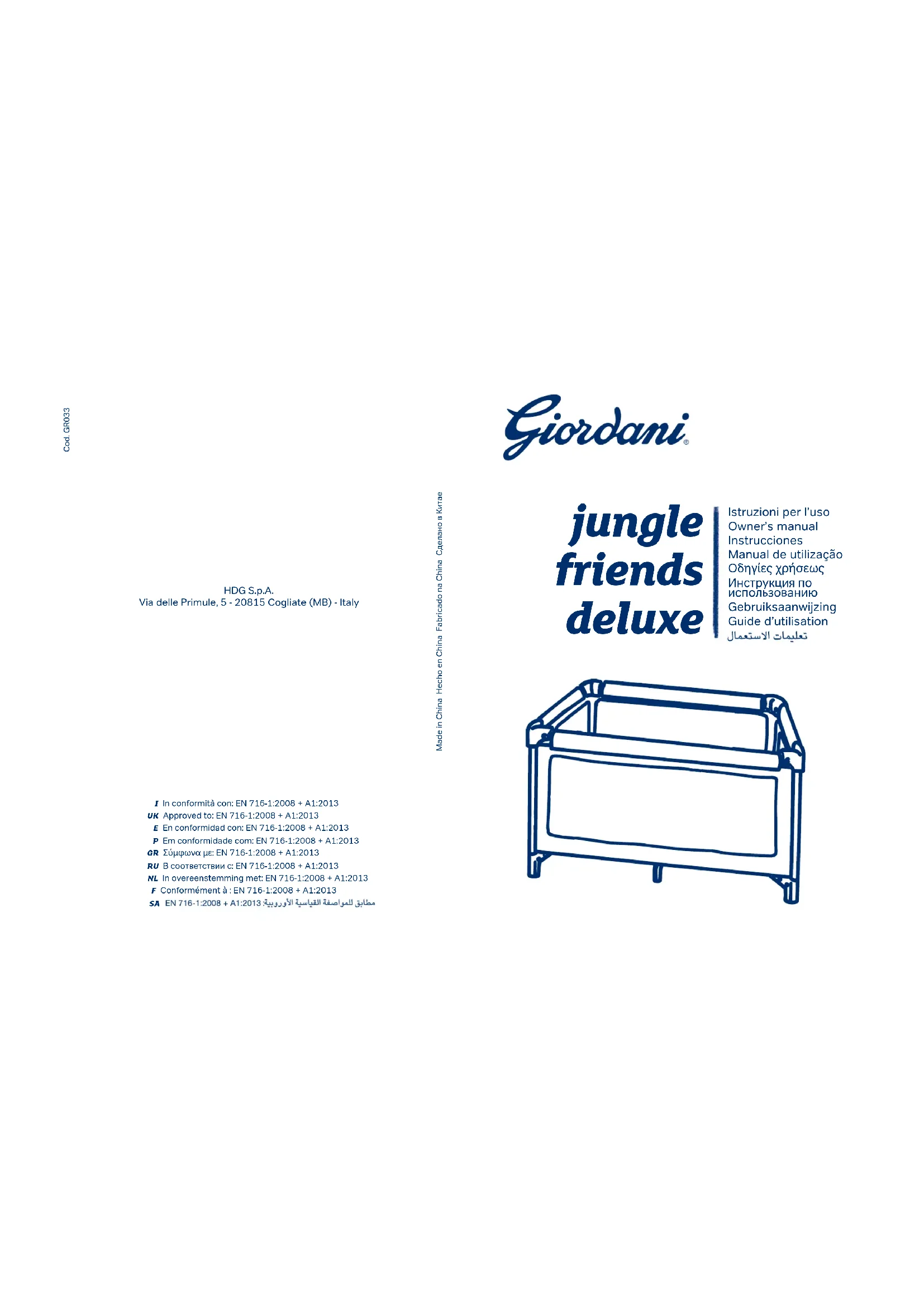 GIORdANI JuNGLE FRIENds dELuxE PETIT LIT DE CAMP (0-4 ANS ENVIRON) MONTAGE du PETIT LIT1. Mettre le petit lit en position verticale et désen ler les languettes autoxantes.2. Prendre les bords des deux côtés du petit lit en les mettant vers le haut.3. Ouvrir le petit lit en tenant le centre soulevé à l’aide de la poignée placée sur le fond en tirant en même temps les 4 bords vers le haut jusqu’à ce qu’ils se bloquent.4. Une fois les 4 bords bloqués, pousser le centre de la base du petit lit vers le bas.5. Accrocher le berceau à l’aide de la fermeture à glissière, comme indiqué dans la gure.6. Enler les 4 tubes dans les parties latérales du berceau, comme indiqué dans la gure.7. Poser le matelas à l’intérieur du berceau.8. Mettre ensuite le matelas correctement en po sition.9. Accrocher la capote en mettant les 2 crochets de façon à ce qu’elle soit tendue des deux côtés, comme indiqué dans la gure.10. Fixer l’arrière de la capote à l’aide des 2 bou tons automatiques placés aux 2 coins arrières du petit lit.11. Positionnement correct des tubes C et D à l’inté rieur des œillets du matelas à langer.ATTENTION ! S’assurer de monter les tubes D correctement. Les crochets des tubes D doivent être tournés vers l’intérieur du matelas à langer, comme indiqué dans la gure.12. Enler les tubes C à l’intérieur des 2 œillets.ATTENTION ! Les trous des tubes C doivent être tournés vers l’extérieur.13. Accrocher les 4 tubes en pressant les boutons situés sur les tubes D tout en les bloquant dans les trous des tubes C jusqu’au déclic qui indique qu’ils sont xés.14. Mettre le matelas à langer près des bords du petit lit. Faire la même chose aux 4 extrémités.15. Pousser le matelas à langer vers le bas jusqu’à ce qu’il soit complètement accroché.16. Attacher les peluches à la capote à l’aide des languettes autofixantes qui se trouvent sur la capote et sur les peluches.17. Entrée latérale avec fermeture à glissière.18. Accrocher la moustiquaire à l’aide des 2 boutons automatiques qui se trouvent sur les 2 extrémi tés extérieures de la capote.19. Tirer la moustiquaire par-dessus la capote ; elle restera xée à l’aide de l’élastique présent le long du bord.20. Tirer la moustiquaire du côté opposé comme indiqué dans la gure jusqu’à ce qu’elle prenne la position correcte indiquée dans la gure 20a.21. Pour bloquer les roues, baisser le levier indiqué dans la gure. Pour les débloquer, le relever.ATTENTION ! Toujours bloquer les roues quand le bébé se trouve dans le petit lit.CONFIGuRATION sIMPLE22. Poser le matelas sur le fond du petit lit.23. Désenfiler ensuite les languettes autofixantes qui se trouvent à l’extérieur du matelas (A) puis les enler à travers les fentes prévues à cet eet situées à la base du petit lit (B) et enn les xer. Faire la même chose des deux côtés.FERMETuRE du PETIT LIT24. Fermer le petit lit en tenant le centre du fond soulevé et en baissant les 4 bords.ATTENTION ! Exécuter attentivement la sé quence 1-2-3 ; soulever d’abord le bord, presser le bouton à l’intérieur puis baisser le bord.25. Tirer la poignée centrale du fond du petit lit vers le haut pour faire en sorte que tout l’article soit rassemblé vers l’intérieur.26. Fermer le petit lit de manière compacte et enrou ler le matelas autour en bloquant les languettes en velcro comme indiqué dans les gures 26 et 26a. 27. Poser le sac sur le haut, enler le petit lit et les accessoires dedans puis fermer le sac à l’aide de la fermeture à glissière prévue à cet eet. ENTRETIENSac porte-lit : le laver à la main avec de l’eau froide et un détersif non agressif. Le laisser sécher sans le repasser.Petit lit et son matelas : nettoyer les taches avec un détersif non agressif et de l’eau. Laisser sécher sans repasser.COMPOsITIONsRevêtement : PolyesterStructure : Acier PolypropylènedIMENsIONsOuvert : L : 120 cm ; H : 77 cm ; P : 75 cm.Fermé : L : 30 cm ; H : 78 cm ; P : 13 cm.2928 AVERTISSEMENTS