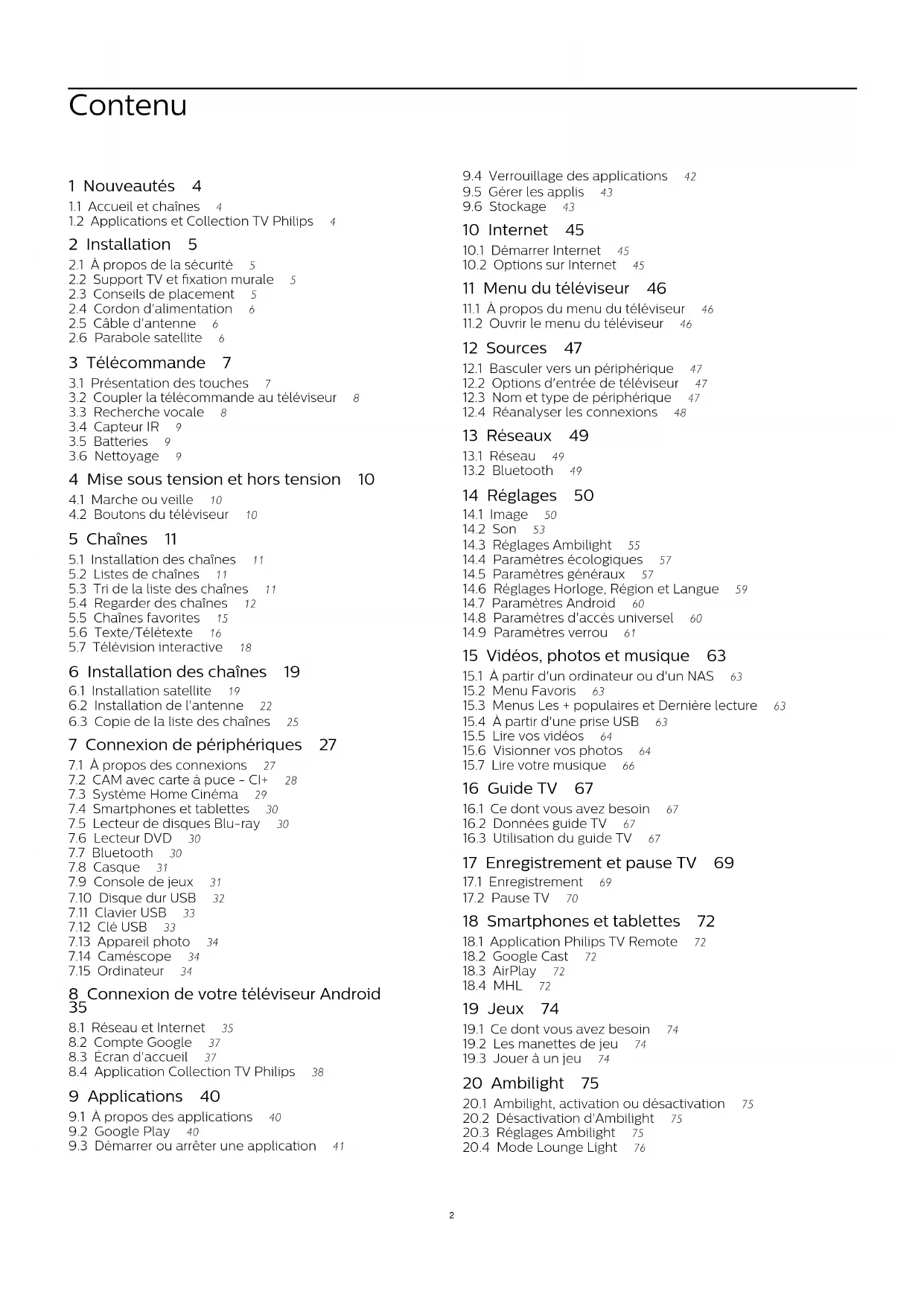 Paramètres Android 37 Paramètres écologiques 57 Pause TV 69 Photos, vidéos et musique 63 Pont hue 56 Problèmes, Chaînes 87 Problèmes, Connexion, Internet 88 Problèmes, Connexion, Wi-Fi 88 Problèmes, connexion HDMI 88 Problèmes, connexion USB 88 Problèmes, Image 87 Problèmes, langue menu incorrecte 88 Problèmes, Son 87 Problèmes, Télécommande 86 Programmes, Recommandations 77