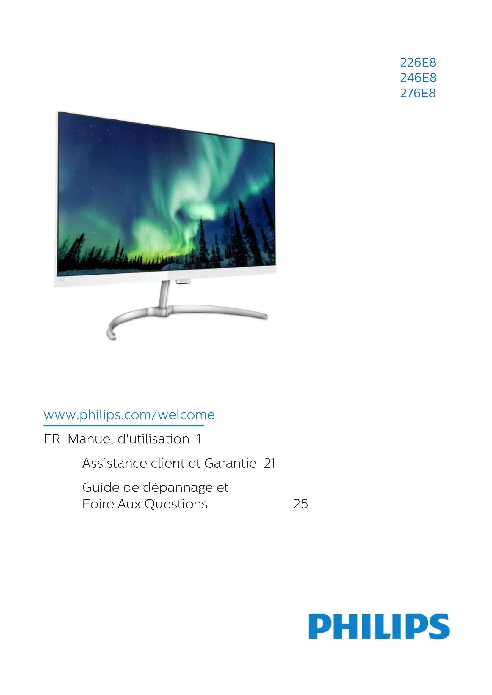 www.philips.com/welcome 226E8 246E8 276E8 FR Manuel d'utilisation 1 Assistance client et Garantie 21 Guide de dépannage et Foire Aux Questions 25Table des matières