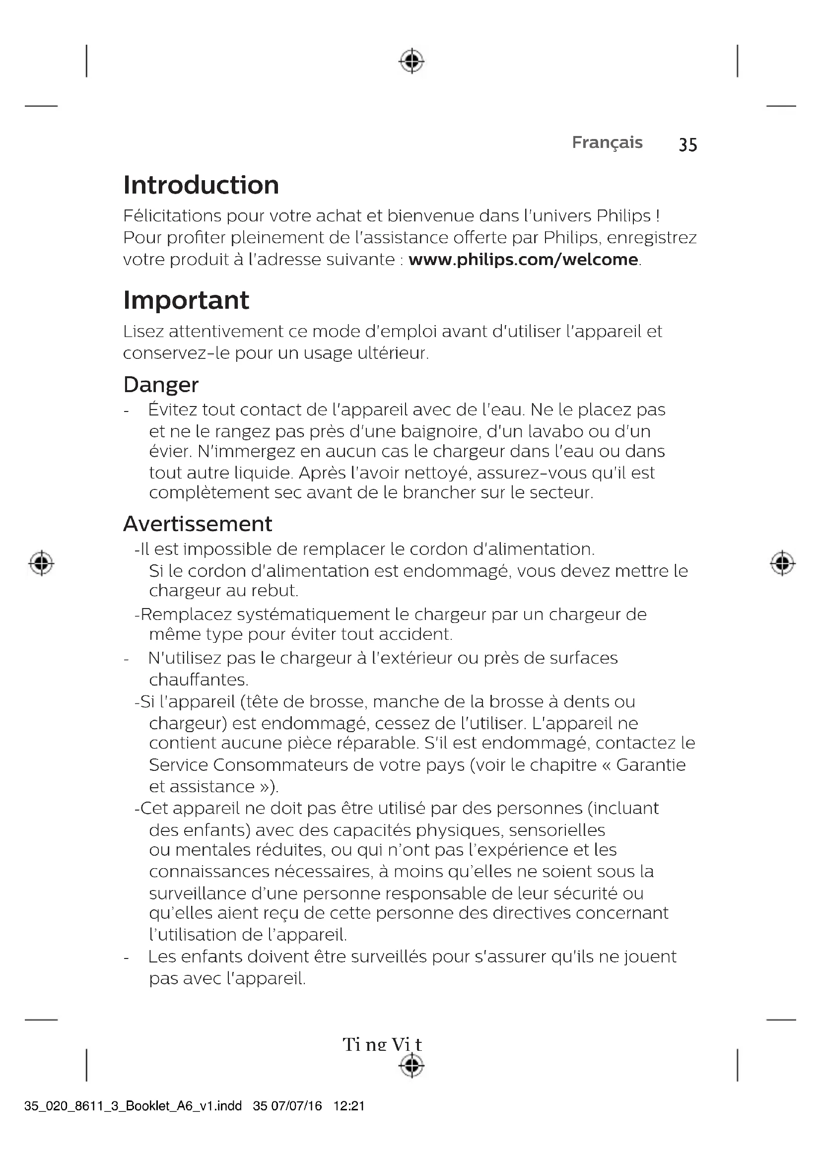 Introduction Félicitations pour votre achat et bienvenue dans l'univers Philips ! Pour proter pleinement de l'assistance oerte par Philips, enregistrez votre produit à l'adresse suivante : www.philips.com/welcome. Important Lisez attentivement ce mode d'emploi avant d'utiliser l'appareil et conservez-le pour un usage ultérieur. Danger - Évitez tout contact de l'appareil avec de l'eau. Ne le placez pas et ne le rangez pas près d'une baignoire, d'un lavabo ou d'un évier. N'immergez en aucun cas le chargeur dans l'eau ou dans tout autre liquide. Après l'avoir nettoyé, assurez-vous qu'il est complètement sec avant de le brancher sur le secteur. Avertissement - Il est impossible de remplacer le cordon d'alimentation. Si le cordon d'alimentation est endommagé, vous devez mettre le chargeur au rebut. - Remplacez systématiquement le chargeur par un chargeur de même type pour éviter tout accident. - N'utilisez pas le chargeur à l'extérieur ou près de surfaces chauantes. - Si l'appareil (tête de brosse, manche de la brosse à dents ou chargeur) est endommagé, cessez de l'utiliser. L'appareil ne contient aucune pièce réparable. S'il est endommagé, contactez le Service Consommateurs de votre pays (voir le chapitre « Garantie et assistance »). - Cet appareil ne doit pas être utilisé par des personnes (incluant des enfants) avec des capacités physiques, sensorielles ou mentales réduites, ou qui n’ont pas l’expérience et les connaissances nécessaires, à moins qu’elles ne soient sous la surveillance d’une personne responsable de leur sécurité ou qu’elles aient reçu de cette personne des directives concernant l’utilisation de l’appareil. - Les enfants doivent être surveillés pour s'assurer qu'ils ne jouent pas avec l'appareil. Ti ng Vi t 4235_020_8611_3_Booklet_A6_v1.indd 35 07/07/16 12:21Français