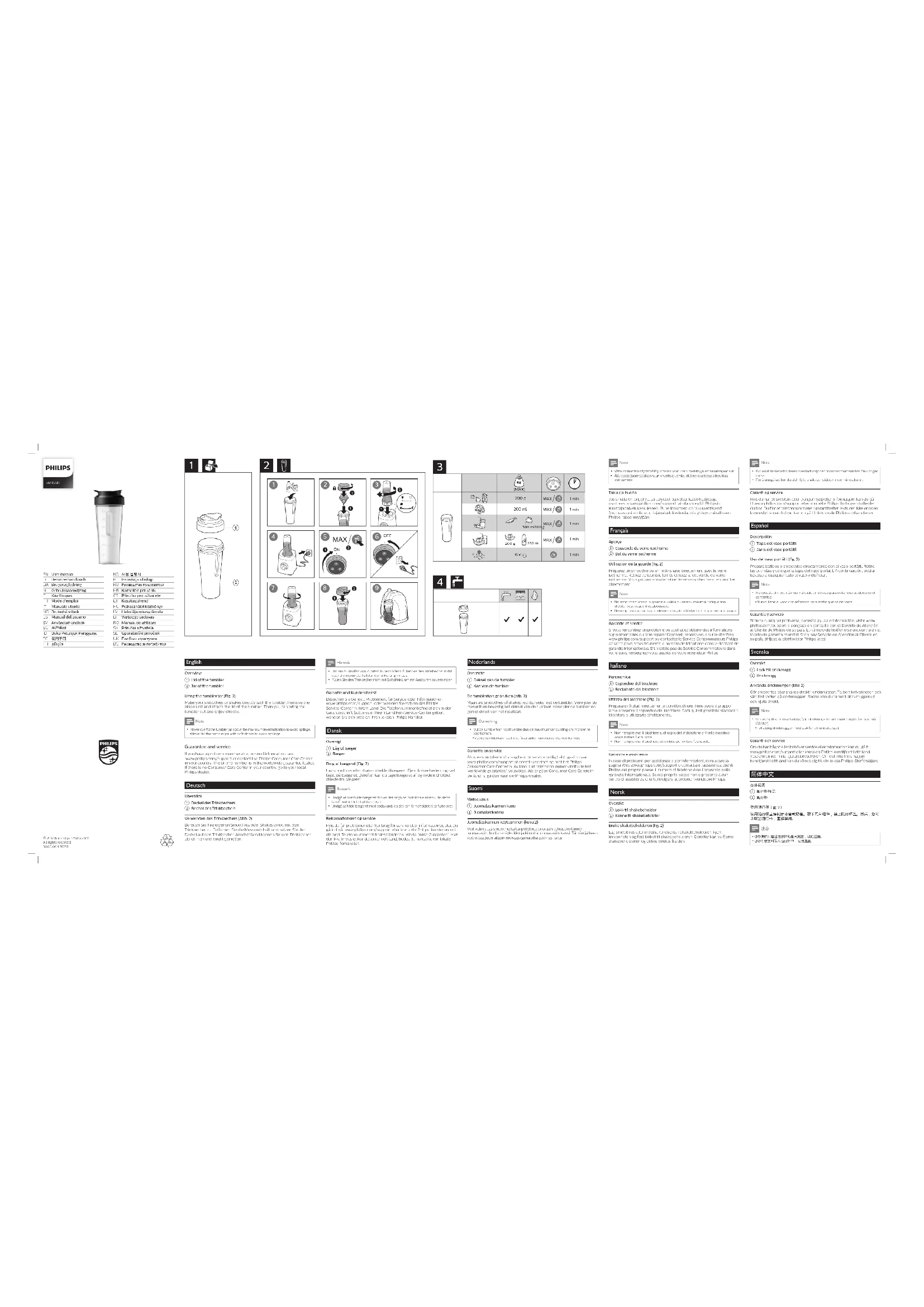 - Ne remplissez jamais la gourde de sodas an d'éviter tout risque d'éclaboussure. Garantie et serviceSi vous rencontrez un problème ou souhaitez obtenir des informations supplémentaires ou faire réparer l’appareil, rendez-vous sur le site Web www.philips.com/support ou contactez le Service Consommateurs Philips de votre pays. Vous trouverez le numéro de téléphone dans le dépliant de garantie internationale. S’il n’existe pas de Service Consommateurs dans votre pays, renseignez-vous auprès de votre revendeur Philips. Italiano Panoramicaa Coperchio del bicchiereb Recipiente del bicchiereUtilizzo del bicchiere (Fig. 2)Preparare i frullati direttamente con il bicchiere. Rimuovere il gruppo lame e inserire il coperchio del bicchiere. Sarà quindi possibile staccare il bicchiere e utilizzarlo direttamente. Note