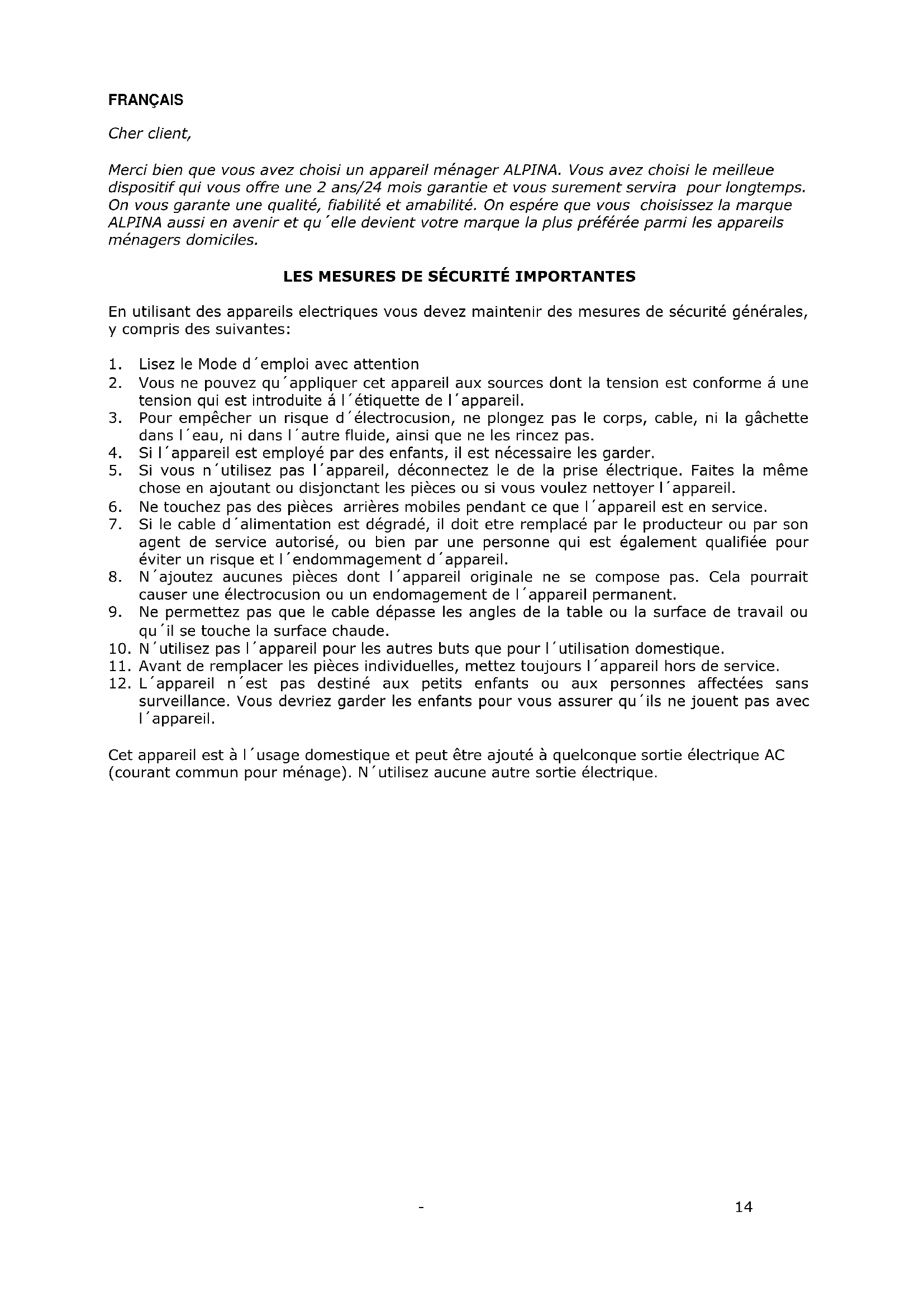 Merci bien que vous avez choisi un appareil ménager ALPINA. Vous avez choisi le meilleure dispositif qui vous offre une 2 ans/24 mois garantie et vous surement servira pour longtemps. On vous garante une qualité, fiabilité et amabilité. On espére que vous choisissez la marque ALPINA aussi en avenir et qu'elle devient votre marque la plus préférée parmi les appareils ménagers domiciles.