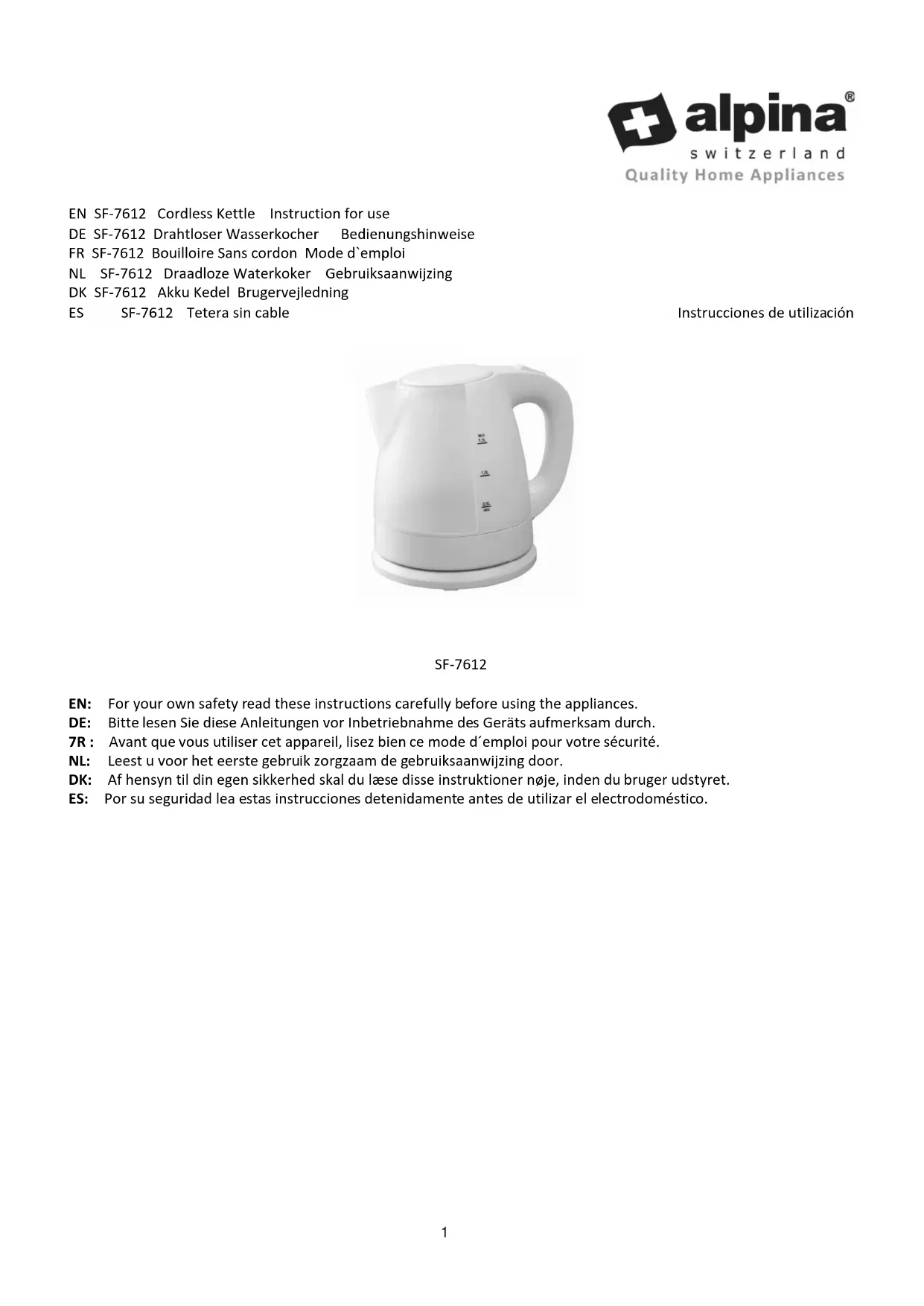 Téléchargez la notice de votre Bouilloire au format PDF gratuitement ! Retrouvez votre notice SF7612 - ALPINA et reprennez votre appareil électronique en main. Sur cette page sont publiés tous les documents nécessaires à l'utilisation de votre appareil SF7612 de la marque ALPINA.