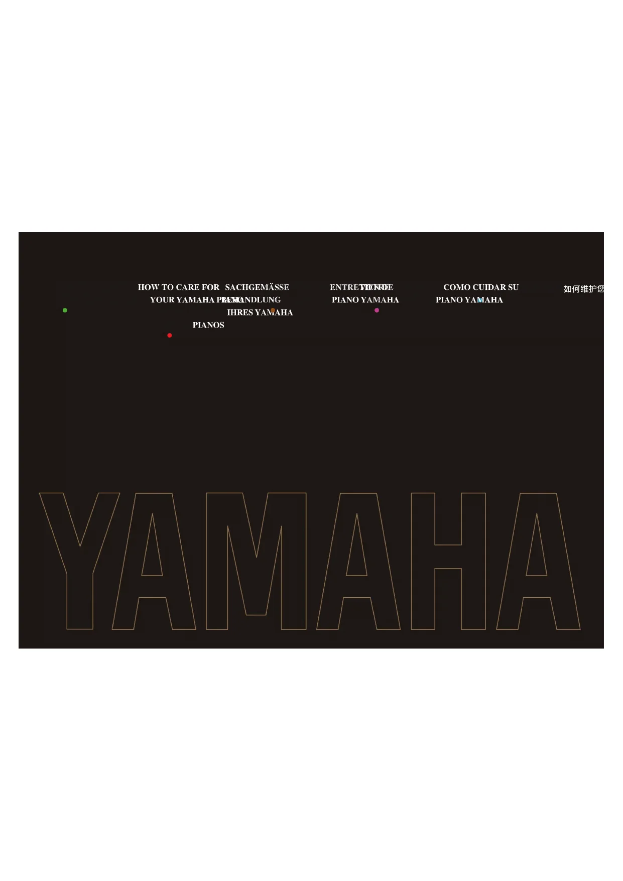 Le piano est un instrument déli- cat qui exige périodiquement une inspection professionnelle. Il y a deux genres d’intervention pro- fessionnelle dont votre piano aura besoin: l’accordage et le réglage. Par accordage on en- tend l’ajustement de chaque note par la tension des cordes. Cha- que corde du piano est tendue à 90kg mais elle se détend à l’usage, ce qui a pour effet un décalage de ton. Les cordes doi- vent être retendues une ou deux fois par an. Le réglage touche tout le mécanisme, le clavier et les mouvements des pédales. Pour un piano à queue en parti- culier, un bon réglage est indis- pensable. Les performances d’un piano dépendent largement de la précision du réglage. L’accordage et le réglage doivent être effectués par un expert. S’il faut régler ou accorder votre piano, consultez votre vendeur ou appelez un spécialiste. Votre vendeur vous conseillera sur la fréquence des réglages, qui dé- pend de l’usage que vous faites de votre piano. Van Gogh Regulieren heißt, alle Funktio- nen des Pianos, nämlich Klavia- tur, Pedal usw. neu aufeinander abzustimmen und so die Harmo- nie wiederherzustellen. Richti- ge Regulierung ist wichtig für alle Flügel und Pianos. Stimmen und Regulieren sollten nur vom Fachmann vorgenommen wer- den. Beauftragen Sie hiermit bitte Ihren Yamaha Händler. Im Fachgeschäft werden Sie auch beraten, wie oft Sie Ihr Piano stimmen lassen sollten. El ajuste comprende la acción total del piano, movimientos de teclado y pedal. Un ajuste ade- cuado es especialmente impor- tante para los pianos de cola. Que el piano toque perfectamen- te o no, depende de la precisión con que ha sido ajustado. El afi- namiento y ajuste debe ser reali- zado únicamente por un exper- to. Cuando su piano requiera uno u otro, consulte con su dis- tribuidor Yamaha o llame a un especialista. Su distribuidor tam- bién puede aconsejarle respecto al intervalo entre los ajustes a su piano, de acuerdo a las circuns- tancias en las cuales es utiliza- do.P.O.Box 3, Hamamatsu, 430-8651 JapanP.O.Box 3, Hamamatsu, 430-8651 Japan
