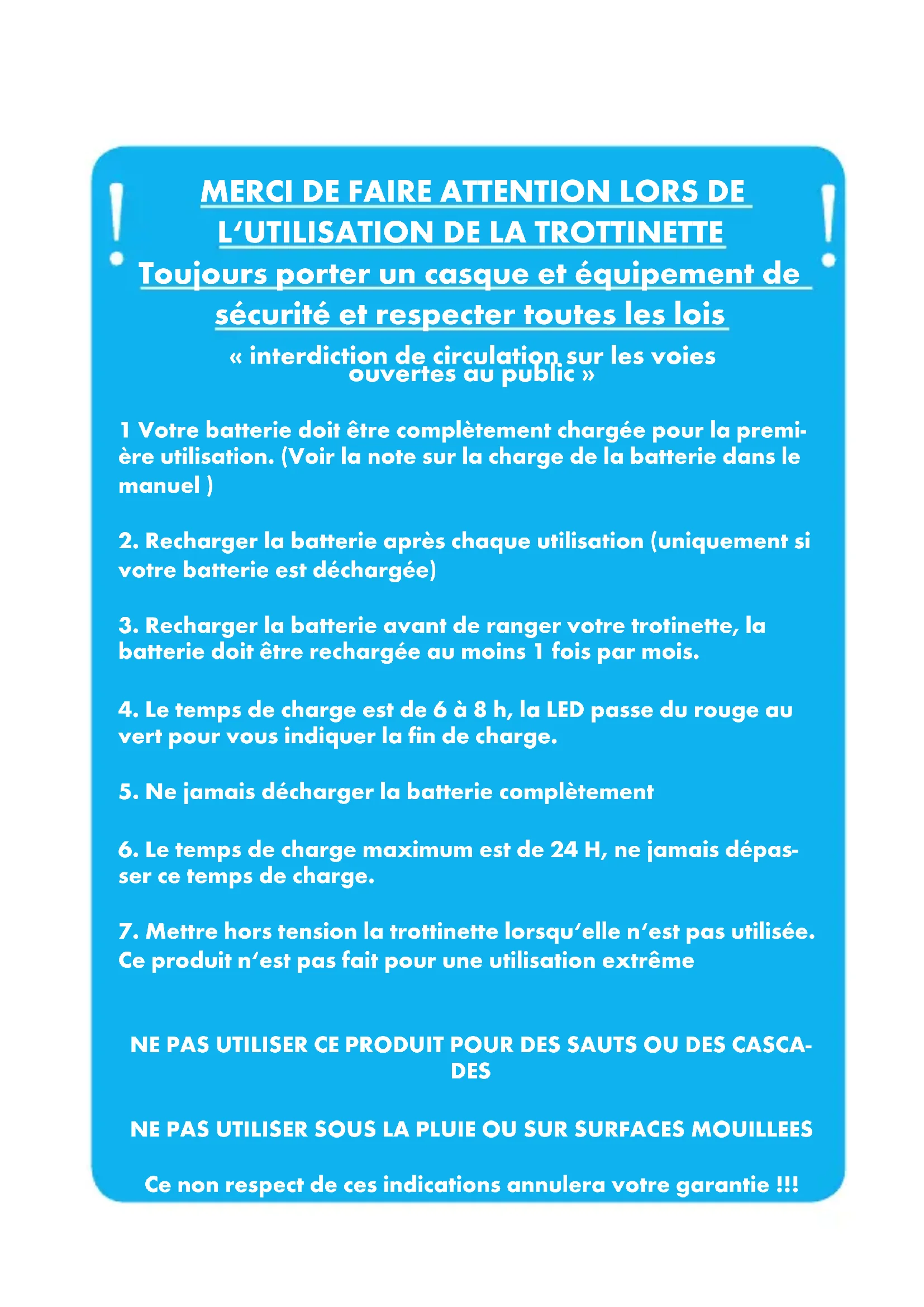 Ce produit n‘est pas fait pour une utilisation extrême NE PAS UTILISER CE PRODUIT POUR DES SAUTS OU DES CASCA- DES NE PAS UTILISER SOUS LA PLUIE OU SUR SURFACES MOUILLEES Ce non respect de ces indications annulera votre garantie !!!ATTENTION! Ce produit n‘est pas homologué pour la route ou autoroute. Une mauvaise utilisation de ce produit peut entraîner des blessures graves. L‘utilisateur peut minimiser ces risques en utilisant des protections comme un casque, kit de protection, gants. L‘utilisation de ces équipements est fortement conseillée.NE PAS UTILISER sur la route, sur surface mouillée, gelée, boueuse, sableuse. Éviter les surfaces pavées, nids de poule et obstacles.NE PAS UTILISER de jet d‘eau pour le nettoyage.Ce produit est conseillé pour des personnes de plus de 14 ans. SECURITE!