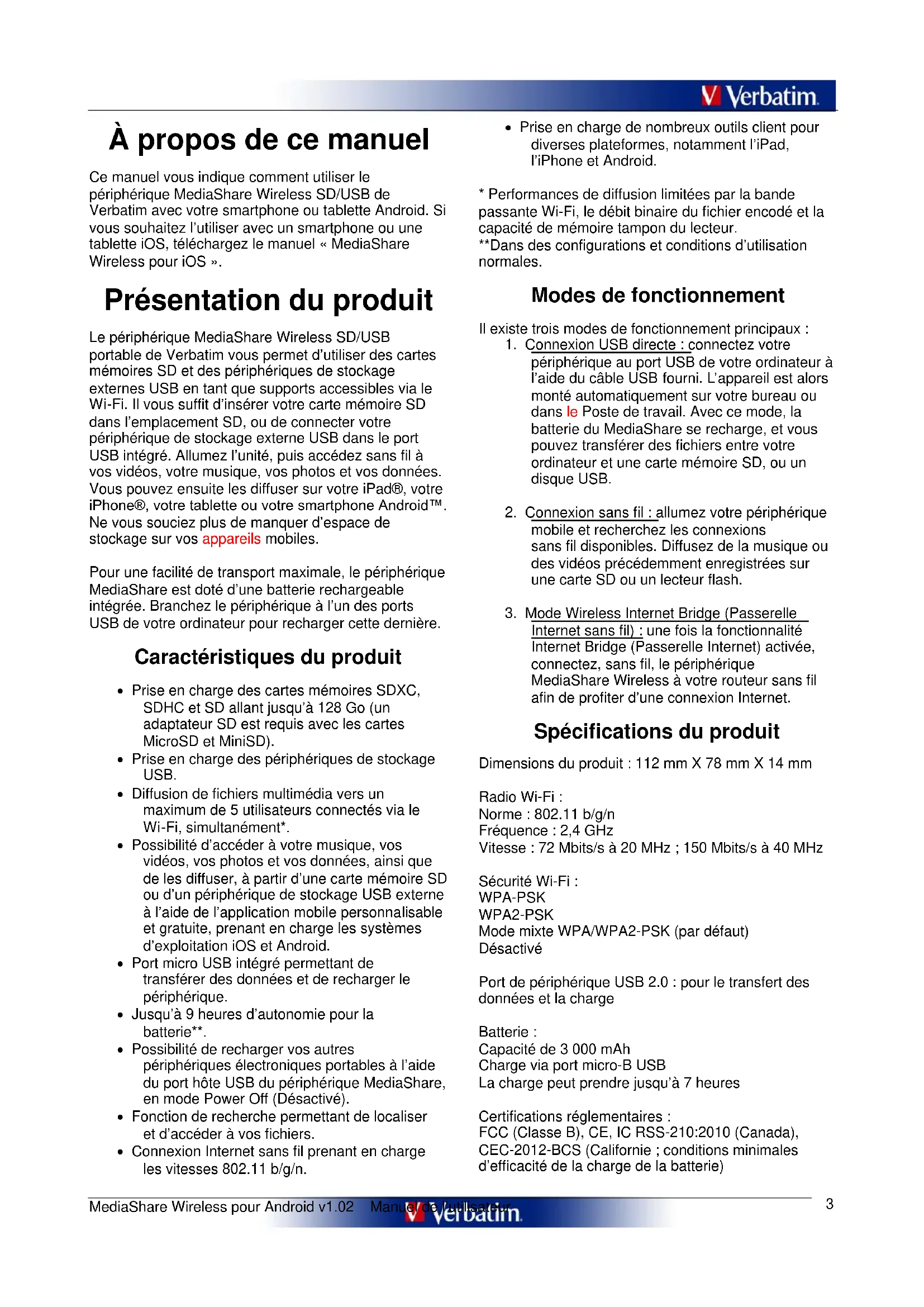 À propos de ce manuel Ce manuel vous indique comment utiliser le périphérique MediaShare Wireless SD/USB de Verbatim avec votre smartphone ou tablette Android. Si vous souhaitez l’utiliser avec un smartphone ou une tablette iOS, téléchargez le manuel « MediaShare Wireless pour iOS ». Présentation du produit Le périphérique MediaShare Wireless SD/USB portable de Verbatim vous permet d’utiliser des cartes mémoires SD et des périphériques de stockage externes USB en tant que supports accessibles via le Wi-Fi. Il vous suffit d’insérer votre carte mémoire SD dans l’emplacement SD, ou de connecter votre périphérique de stockage externe USB dans le port USB intégré. Allumez l’unité, puis accédez sans fil à vos vidéos, votre musique, vos photos et vos données. Vous pouvez ensuite les diffuser sur votre iPad®, votre iPhone®, votre tablette ou votre smartphone Android™. Ne vous souciez plus de manquer d’espace de stockage sur vos appareils mobiles. Pour une facilité de transport maximale, le périphérique MediaShare est doté d’une batterie rechargeable intégrée. Branchez le périphérique à l’un des ports USB de votre ordinateur pour recharger cette dernière. Caractéristiques du produit Prise en charge des cartes mémoires SDXC, SDHC et SD allant jusqu’à 128 Go (un adaptateur SD est requis avec les cartes MicroSD et MiniSD). Prise en charge des périphériques de stockage USB. Diffusion de fichiers multimédia vers un maximum de 5 utilisateurs connectés via le Wi-Fi, simultanément*. Possibilité d’accéder à votre musique, vos vidéos, vos photos et vos données, ainsi que de les diffuser, à partir d’une carte mémoire SD ou d’un périphérique de stockage USB externe à l’aide de l’application mobile personnalisable et gratuite, prenant en charge les systèmes d’exploitation iOS et Android. Port micro USB intégré permettant de transférer des données et de recharger le périphérique. Jusqu’à 9 heures d’autonomie pour la batterie**. Possibilité de recharger vos autres périphériques électroniques portables à l’aide du port hôte USB du périphérique MediaShare, en mode Power Off (Désactivé). Fonction de recherche permettant de localiser et d’accéder à vos fichiers. Connexion Internet sans fil prenant en charge les vitesses 802.11 b/g/n. Prise en charge de nombreux outils client pour diverses plateformes, notamment l’iPad, l’iPhone et Android.