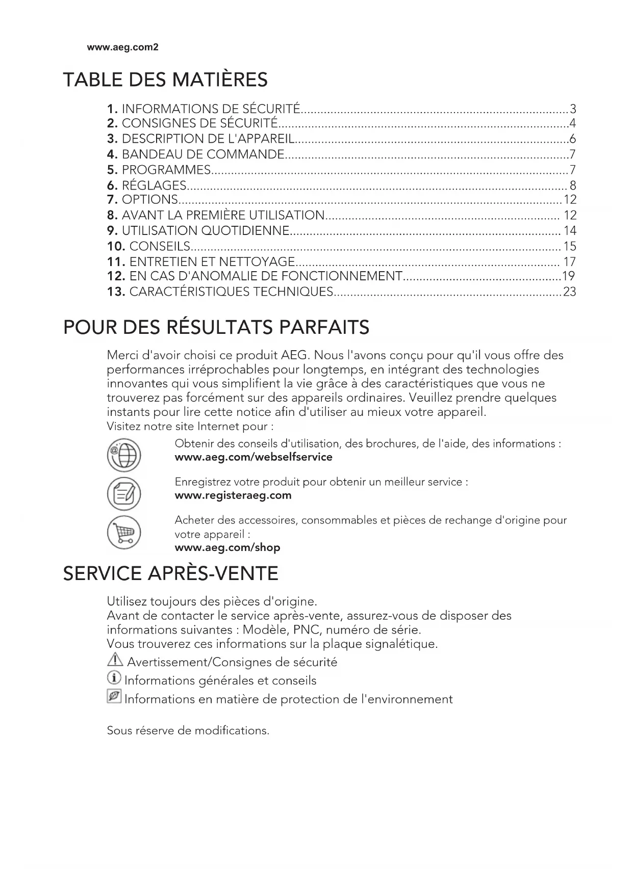 Merci d'avoir choisi ce produit AEG. Nous l'avons conçu pour qu'il vous offre des performances irréprochables pour longtemps, en intégrant des technologies innovantes qui vous simplifient la vie grâce à des caractéristiques que vous ne trouverez pas forcément sur des appareils ordinaires. Veuillez prendre quelques instants pour lire cette notice afin d'utiliser au mieux votre appareil. Visitez notre site Internet pour : Obtenir des conseils d'utilisation, des brochures, de l'aide, des informations : www.aeg.com/webselfservice Enregistrez votre produit pour obtenir un meilleur service : www.registeraeg.com Acheter des accessoires, consommables et pièces de rechange d'origine pour votre appareil : www.aeg.com/shop