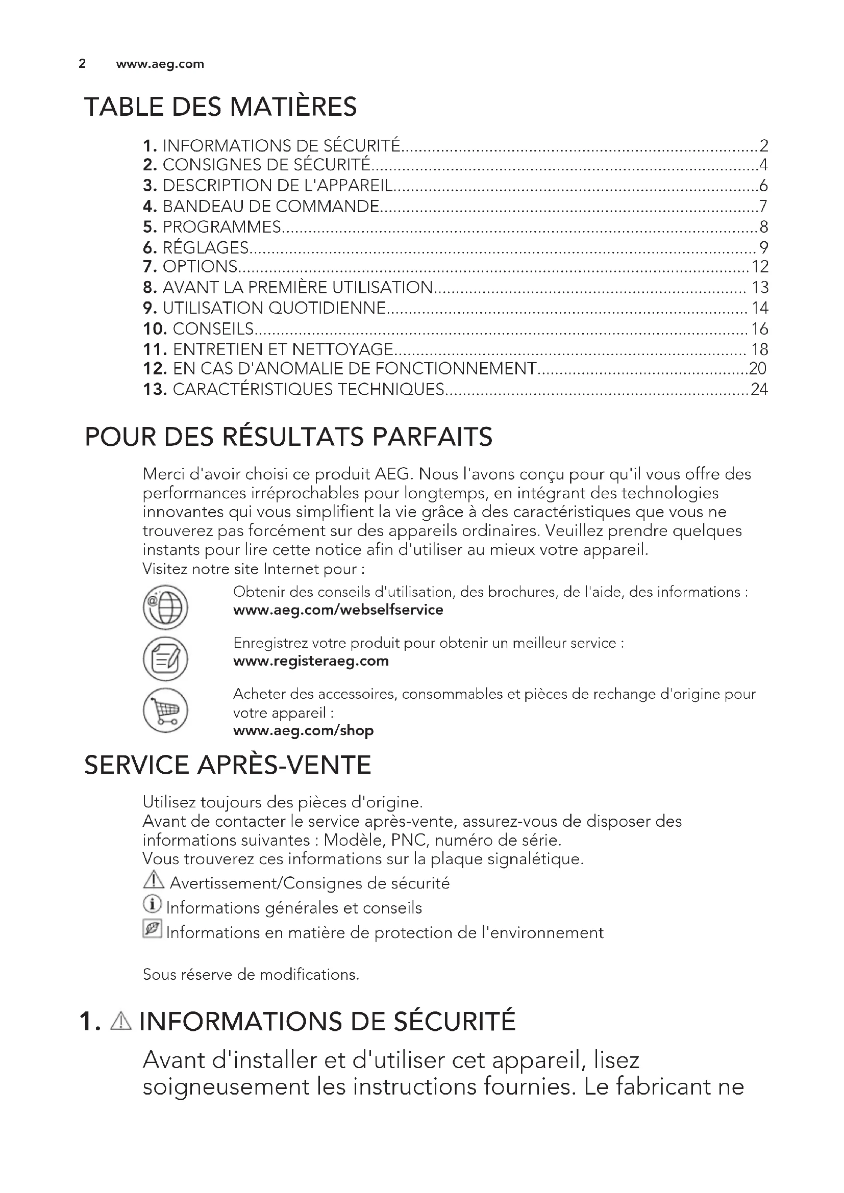 Avant d'installer et d'utiliser cet appareil, lisez soigneusement les instructions fournies. Le fabricant ne www.aeg.com 2pourra être tenu pour responsable des blessures et dégâts résultant d'une mauvaise installation ou utilisation. Conservez toujours les instructions dans un lieu sûr et accessible pour vous y référer ultérieurement.