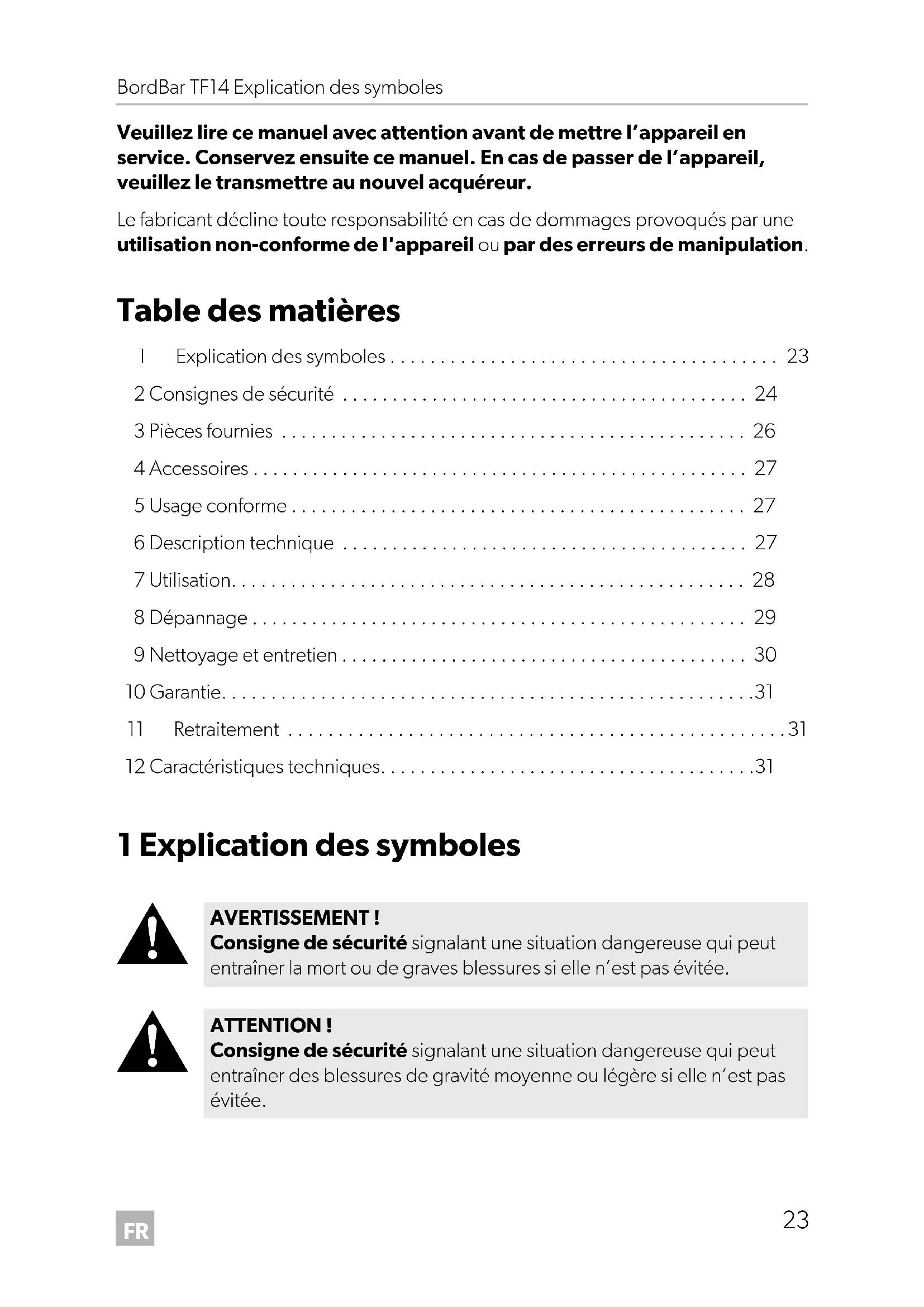 - Veuillez lire ce manuel avec attention avant de mettre l’appareil en service. Conservez ensuite ce manuel. En cas de passer de l’appareil, veuillez le transmettre au nouvel acquéreur. Le fabricant décline toute responsabilité en cas de dommages provoqués par une utilisation non-conforme de l'appareil ou par des erreurs de manipulation. Table des matières 1 Explication des symboles p. 23