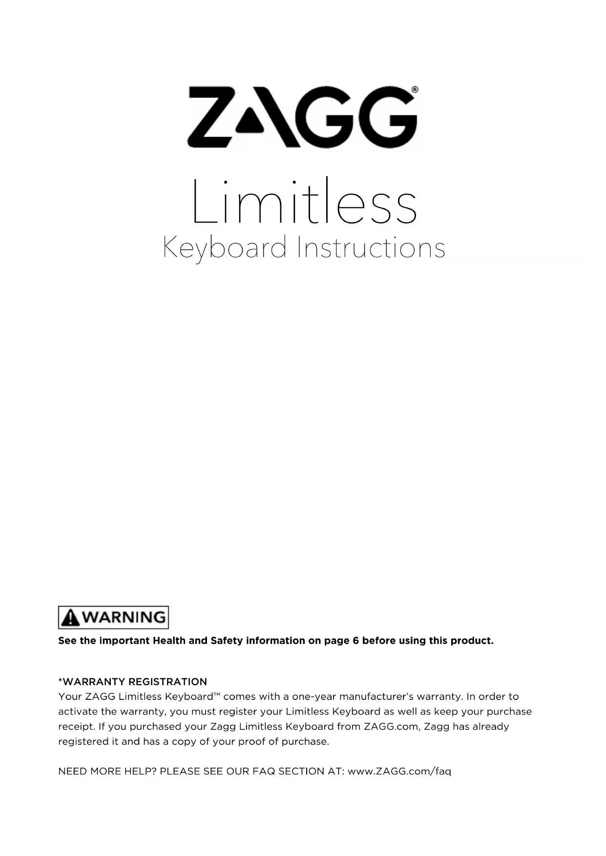 Votre Clavier Limitless ZAGG® est livré avec une garantie du fabricant d’un an. Pour activer la ga- rantie, vous devez enregistrer votre Clavier Limitless ainsi que garder votre facture d’achat. Si vous avez acheté votre Clavier Limitless ZAGG® chez ZAGG.com, ZAGG l’a déjà enregistré et dispose d’une copie de votre preuve d’achat. BESOIN D’AIDE ? VEUILLEZ VISITER NOTRE SECTION FAQ À : www.ZAGG.com/faq Veuillez consultez les importantes informations sur la santé et la sécurité à la page 7 avant d’utiliser ce produit.INTRODUCTION