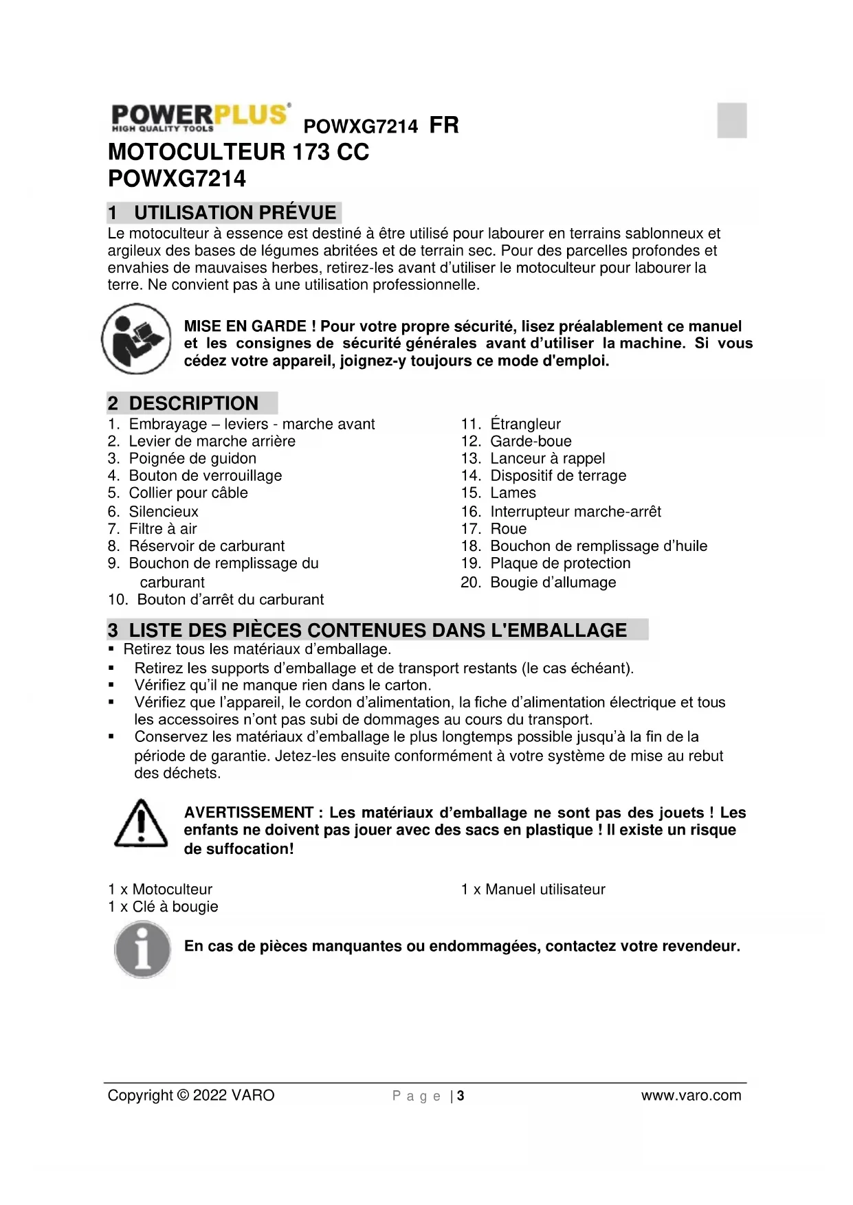 enfants ne doivent pas jouer avec des sacs en plastique ! Il existe un risque de suffocation! 1 x Motoculteur 1 x Clé à bougie 1 x Manuel utilisateur En cas de pièces manquantes ou endommagées, contactez votre revendeur.POWXG7214 FR Copyright © 2022 VARO P a g e | 4 www.varo.com 4 PICTOGRAMMES Les symboles suivants sont utilisés dans ce mode d’emploi et/ou sur la machine :