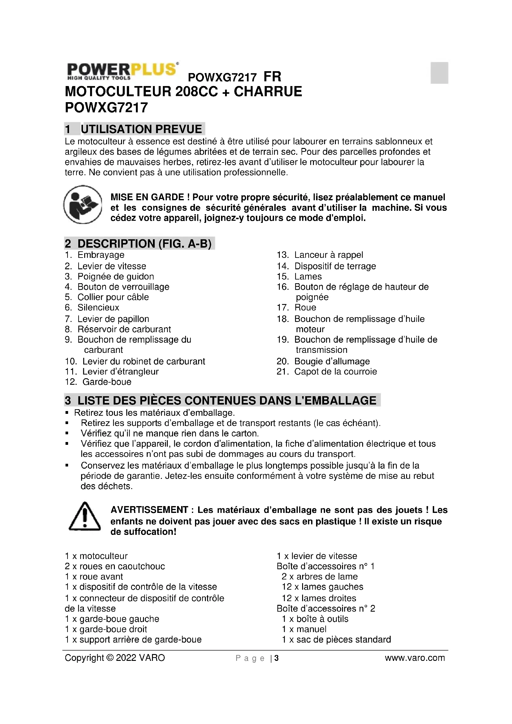 enfants ne doivent pas jouer avec des sacs en plastique ! Il existe un risque de suffocation! 1 x motoculteur 2 x roues en caoutchouc 1 x roue avant 1 x dispositif de contrôle de la vitesse 1 x connecteur de dispositif de contrôle de la vitesse 1 x garde-boue gauche 1 x garde-boue droit 1 x support arrière de garde-boue 1 x levier de vitesse Boîte d’accessoires n° 1 2 x arbres de lame 12 x lames gauches 12 x lames droites Boîte d’accessoires n° 2 1 x boîte à outils 1 x manuel 1 x sac de pièces standardPOWXG7217 FR Copyright © 2022 VARO P a g e | 4 www.varo.com 1 x charrue unilatérale En cas de pièces manquantes ou endommagées, contactez votre revendeur. 4 PICTOGRAMMES Les symboles suivants sont utilisés dans ce mode d’emploi et/ou sur la machine :