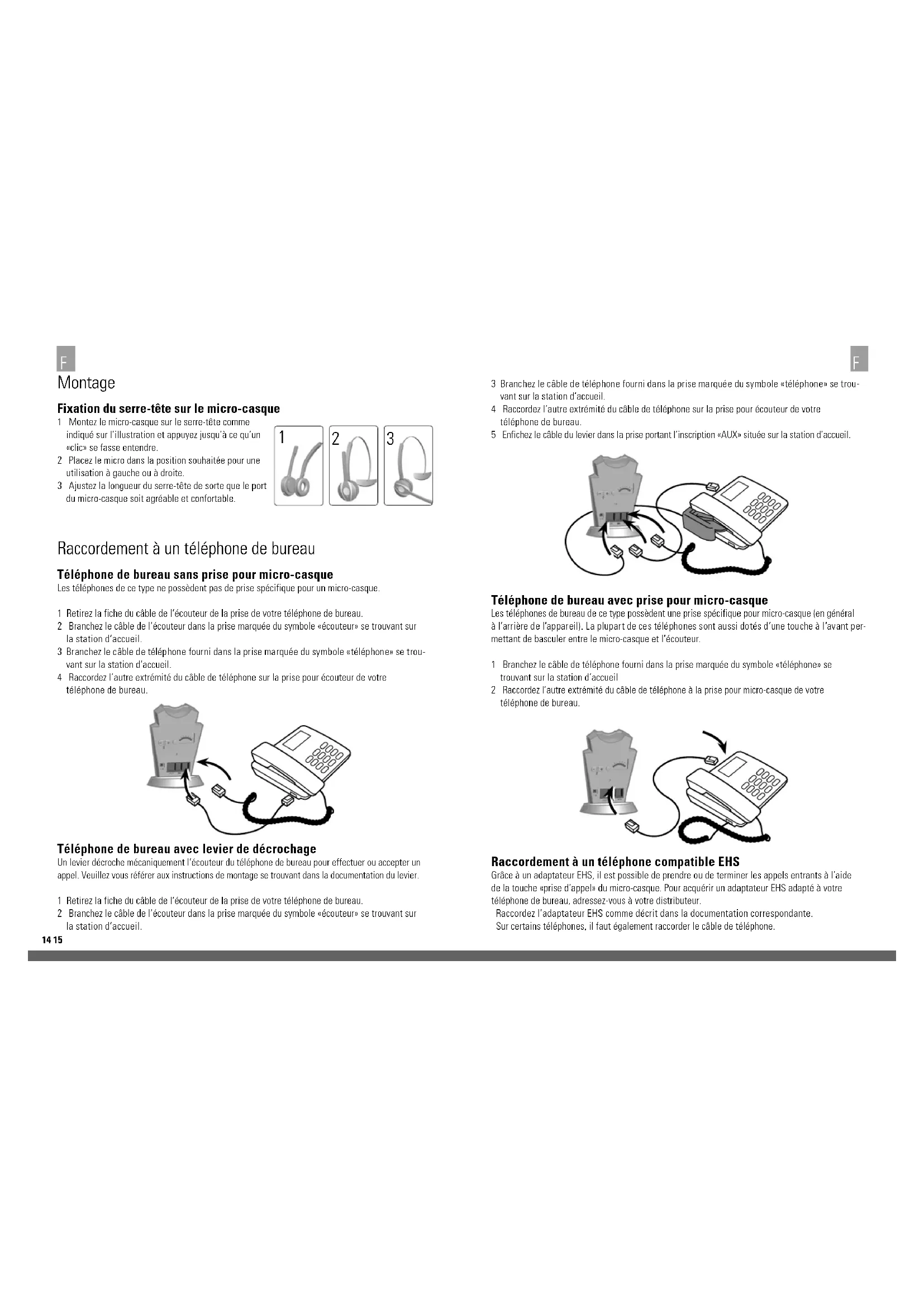 Headset-Akku Akku-Typ: Lithium-Ionen-Polymer Akku-Kapazität: 300 mA/h, typisch Sprechzeit: Bis zu 8 Stunden Akku-Lebensdauer: Mind. 1000 Ladezyklen Standby-Zeit: Mind. 50 Stunden Betriebstemperatur: –20 ˚C bis +60 ˚C. Ladezeit: 20% Aufladung in weniger als 20 Minuten, 50 % in weniger als 45 Minuten, volle Aufladung in weniger als 3 Stunden Lagerbeständigkeit des Akkus: Die Ladung des Headset-Akkus bleibt im ausgeschalteten Zustand für mindes- tens 6 Monate erhalten, bevor der Akku erneut geladen werden muss. Basisstation Fox FX 810 DECT Betriebsbedingungen: 0 ˚C bis +40 ˚C; max. 95 % relative Luftfeuchtigkeit (nicht kondensierend) Ladedock: Passend für die Fox FX 810 DECT-Headsetserie Tischtelefonanschlüsse: RJ-11 für Hörer, RJ-11 für Telefonapparat (oder Headsetanschluss), RJ-45 für AUX (für EHS-Adapter oder Lifter) Produkt-Entsorgung Bitte entsorgen Sie das Headset gemäss den örtlichen Vorschriften und nutzen Sie vorhandene Recyclingeinrich- tungen. Werfen Sie das Headset nicht in den Hausmüll. Das Headset darf nicht mit Feuer in Berührung kommen, da sonst der Akku explodieren könnte. Auch bei Beschädigung kann der Akku explodieren. D14 15 Montage Fixation du serre-tête sur le micro-casque 1 Montez le micro-casque sur le serre-tête comme indiqué sur l’illustration et appuyez jusqu’à ce qu’un «clic» se fasse entendre. 2 Placez le micro dans la position souhaitée pour une utilisation à gauche ou à droite. 3 Ajustez la longueur du serre-tête de sorte que le port du micro-casque soit agréable et confortable. Raccordement à un téléphone de bureau Téléphone de bureau sans prise pour micro-casque Les téléphones de ce type ne possèdent pas de prise spécifique pour un micro-casque. 1 Retirez la fiche du câble de l’écouteur de la prise de votre téléphone de bureau. 2 Branchez le câble de l’écouteur dans la prise marquée du symbole «écouteur» se trouvant sur la station d’accueil. 3 Branchez le câble de téléphone fourni dans la prise marquée du symbole «téléphone» se trou- vant sur la station d’accueil. 4 Raccordez l’autre extrémité du câble de téléphone sur la prise pour écouteur de votre téléphone de bureau. Téléphone de bureau avec levier de décrochage Un levier décroche mécaniquement l’écouteur du téléphone de bureau pour effectuer ou accepter un appel. Veuillez vous référer aux instructions de montage se trouvant dans la documentation du levier. 1 Retirez la fiche du câble de l’écouteur de la prise de votre téléphone de bureau. 2 Branchez le câble de l’écouteur dans la prise marquée du symbole «écouteur» se trouvant sur la station d’accueil.