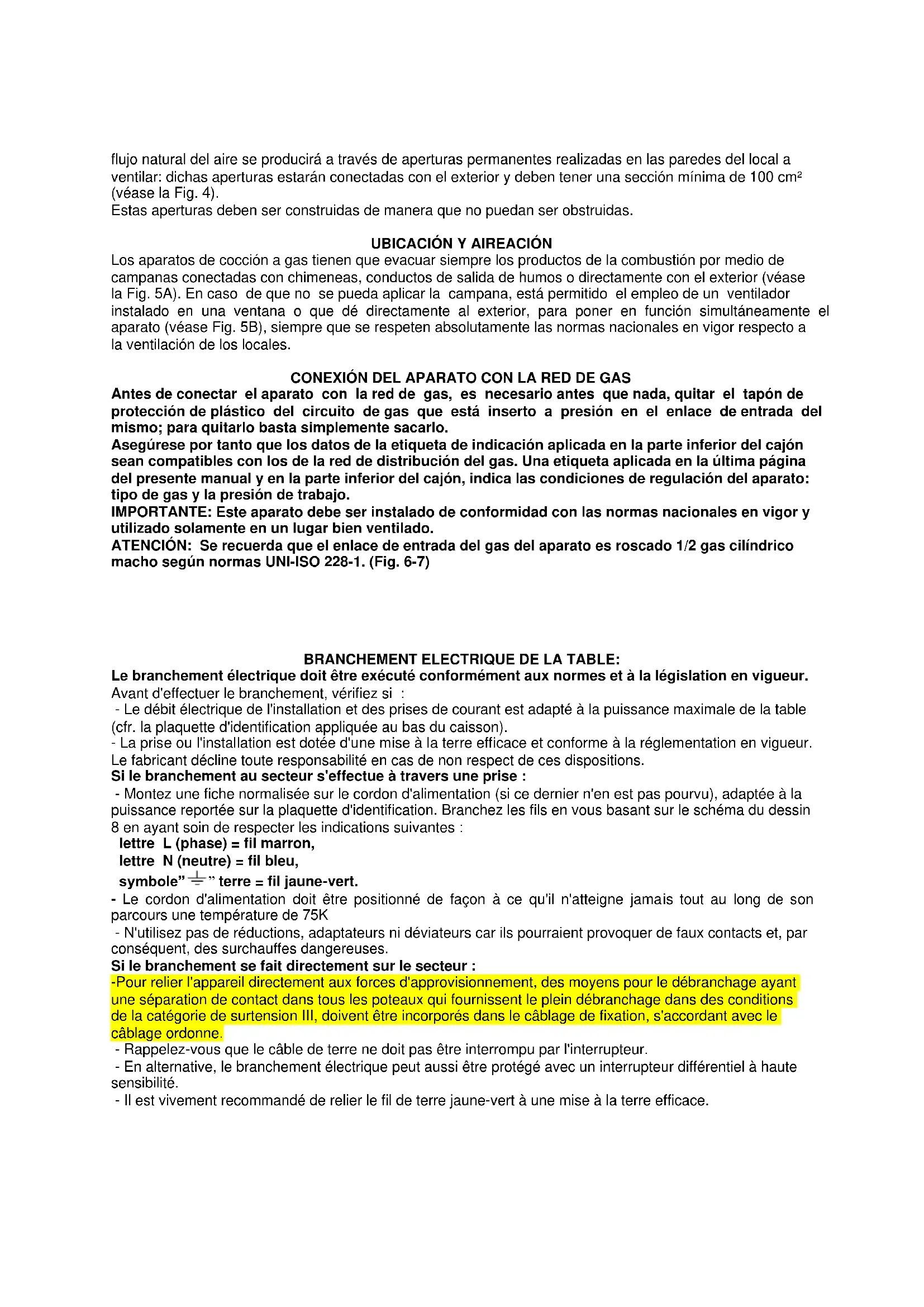NOTE : Le fonctionnement d'une hotte d'aspiration peut avoir influence sur les autres appareils a gaz qui fonctionnent dans le meme local ; en chaque cas elle doit être eventuellement installée conformement aux normes nationals en vigueur.