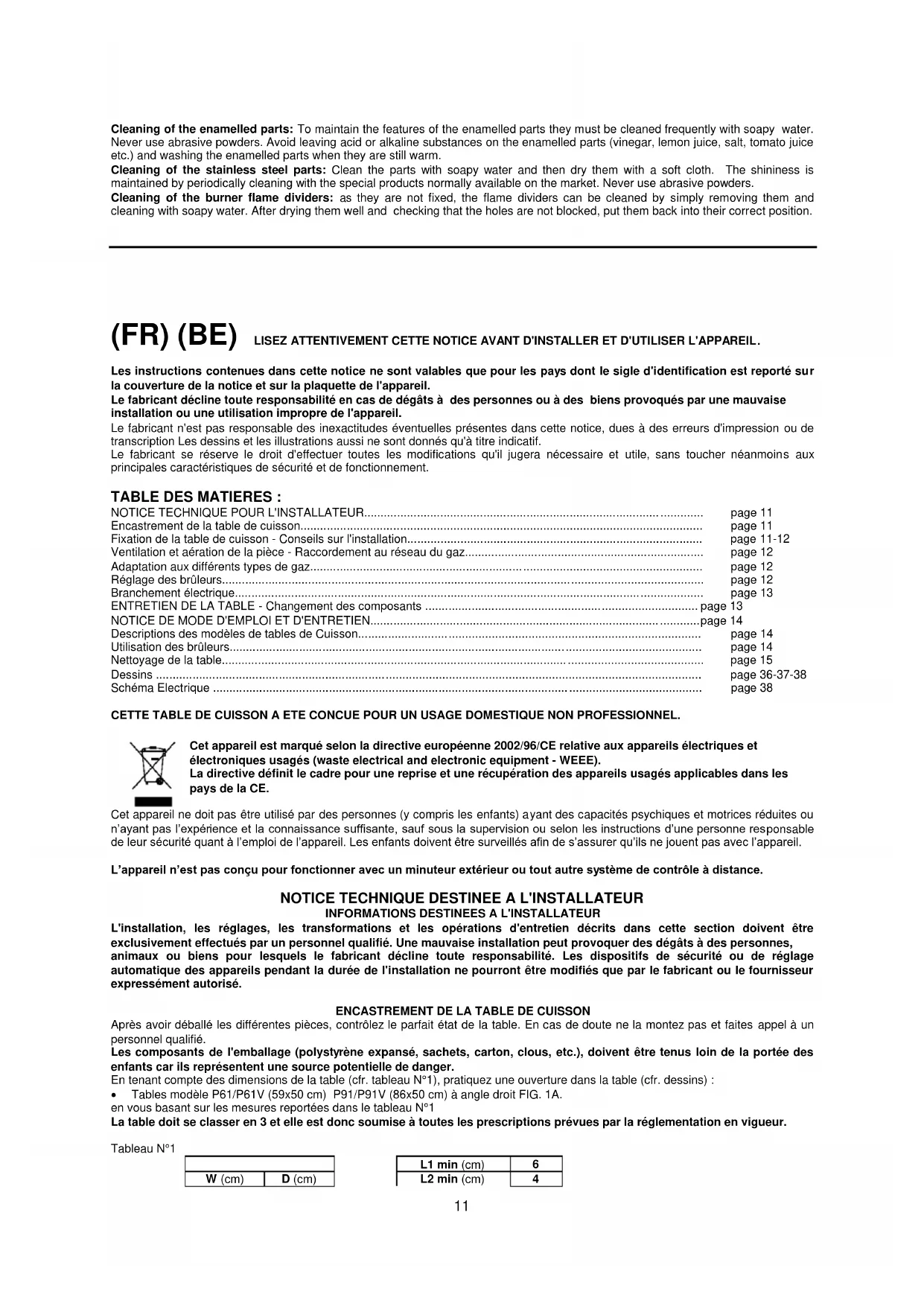 (FR) (BE) LISEZ ATTENTIVEMENT CETTE NOTICE AVANT D'INSTALLER ET D'UTILISER L'APPAREIL. Les instructions contenues dans cette notice ne sont valables que pour les pays dont le sigle d'identification est reporté sur la couverture de la notice et sur la plaquette de l'appareil. Le fabricant décline toute responsabilité en cas de dégâts à des personnes ou à des biens provoqués par une mauvaise installation ou une utilisation impropre de l'appareil. Le fabricant n'est pas responsable des inexactitudes éventuelles présentes dans cette notice, dues à des erreurs d'impression ou de transcription Les dessins et les illustrations aussi ne sont donnés qu'à titre indicatif. Le fabricant se réserve le droit d'effectuer toutes les modifications qu'il jugera nécessaire et utile, sans toucher néanmoins aux principales caractéristiques de sécurité et de fonctionnement. TABLE DES MATIERES : NOTICE TECHNIQUE POUR L'INSTALLATEUR...................................................................................................... page 11 Encastrement de la table de cuisson......................................................................................................................... page 11 Fixation de la table de cuisson - Conseils sur l'installation......................................................................................... page 11-12 Ventilation et aération de la pièce - Raccordement au réseau du gaz........................................................................ page 12 Adaptation aux différents types de gaz...................................................................................................................... page 12 Réglage des brûleurs................................................................................................................................................. page 12 Branchement électrique............................................................................................................................................. page 13 ENTRETIEN DE LA TABLE - Changement des composants .................................................................................. page 13 NOTICE DE MODE D'EMPLOI ET D'ENTRETIEN................................................................................................... page 14 Descriptions des modèles de tables de Cuisson....................................................................................................... page 14 Utilisation des brûleurs.............................................................................................................................................. page 14 Nettoyage de la table................................................................................................................................................. page 15 Dessins .................................................................................................................................................................... page 36-37-38 Schéma Electrique ................................................................................................................................................... page 38 CETTE TABLE DE CUISSON A ETE CONCUE POUR UN USAGE DOMESTIQUE NON PROFESSIONNEL. Cet appareil est marqué selon la directive européenne 2002/96/CE relative aux appareils électriques et électroniques usagés (waste electrical and electronic equipment - WEEE). La directive définit le cadre pour une reprise et une récupération des appareils usagés applicables dans les pays de la CE. Cet appareil ne doit pas être utilisé par des personnes (y compris les enfants) ayant des capacités psychiques et motrices réduites ou n’ayant pas l’expérience et la connaissance suffisante, sauf sous la supervision ou selon les instructions d’une personne responsable de leur sécurité quant à l’emploi de l’appareil. Les enfants doivent être surveillés afin de s’assurer qu’ils ne jouent pas avec l’appareil. L’appareil n’est pas conçu pour fonctionner avec un minuteur extérieur ou tout autre système de contrôle à distance.