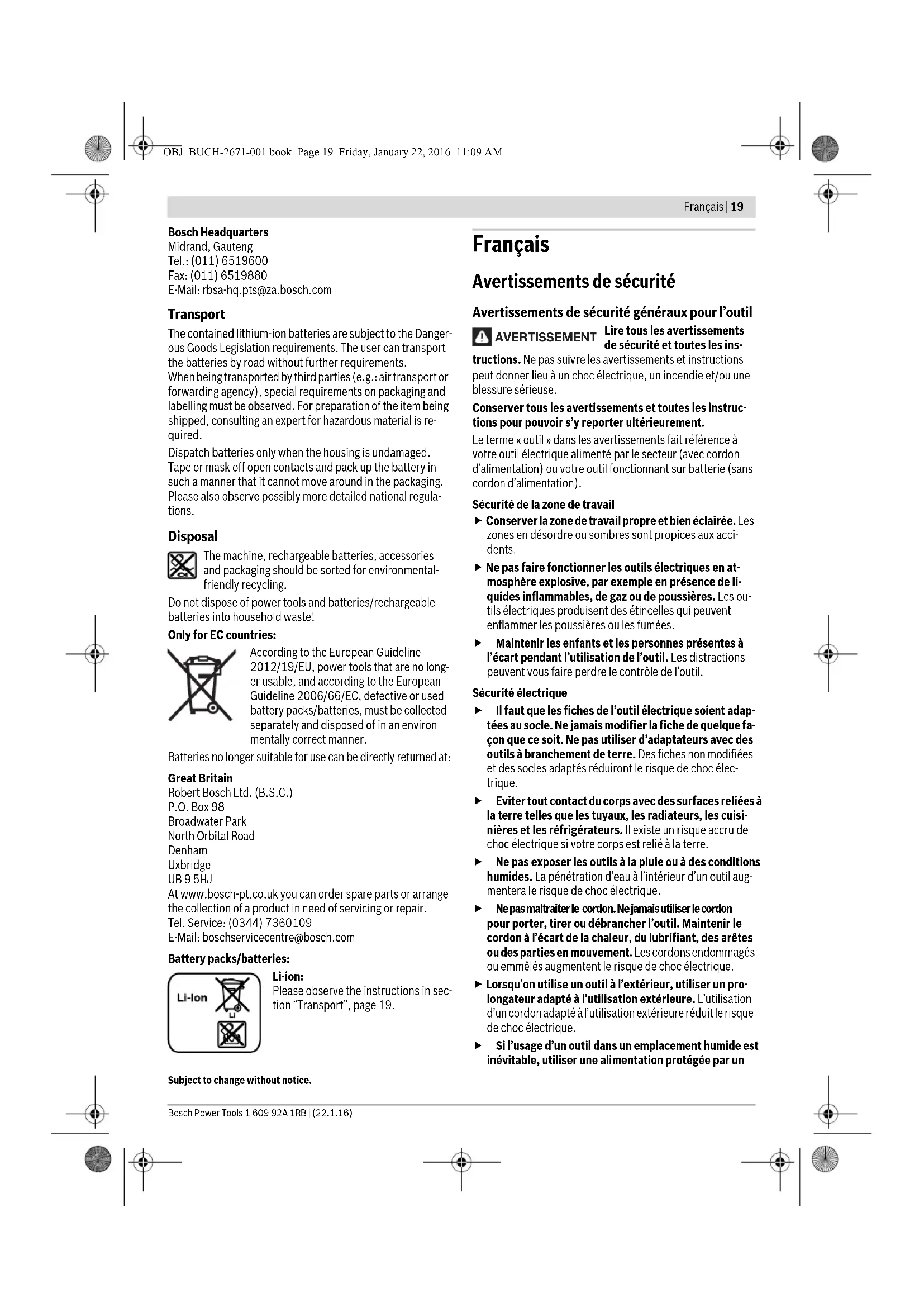 *selon l’accumulateur utilisé ** performances réduites à des températures <à 0 °C OBJ_BUCH-2671-001.book Page 22 Friday, January 22, 2016 11:09 AMFrançais | 23 Bosch Power Tools 1 609 92A 1RB | (22.1.16) Le niveau d’oscillation indiqué dans ces instructions d’utilisa- tion a été mesuré conformément à la norme EN 60745 et peut être utilisé pour une comparaison d’outils électroportatifs. Il est également approprié pour une estimation préliminaire de la charge vibratoire. Le niveau d’oscillation correspond aux utilisations principales de l’outil électroportatif. Si l’outil électrique est néanmoins utilisé pour d’autres applications, avec différents accessoires ou d’autres outils de travail ou s’il est mal entretenu, le niveau d’oscillation peut être différent. Ceci peut augmenter consi- dérablement la charge vibratoire pendant toute la durée de travail. Pour une estimation précise de la charge vibratoire, il est re- commandé de prendre aussi en considération les périodes pendant lesquelles l’appareil est éteint ou en fonctionnement, mais pas vraiment utilisé. Ceci peut réduire considérable- ment la charge vibratoire pendant toute la durée de travail. Déterminez des mesures de protection supplémentaires pour protéger l’utilisateur des effets des vibrations, telles que par exemple : Entretien de l’outil électrique et des outils de tra- vail, maintenir les mains chaudes, organisation des opéra- tions de travail. Montage Chargement de l’accu Note : L’accu est fourni en état de charge faible. Afin de garan- tir la puissance complète de l’accu, chargez complètement l’accu dans le chargeur avant la première mise en service. La batterie Lithium-ion peut être rechargée à tout moment, sans que sa durée de vie n’en soit réduite. Le fait d’inter- rompre le processus de charge n’endommage pas la batterie. Grâce à la Protection Electronique des Cellules « Electronic Cell Protection (ECP) », l’accu à ions lithium est protégé contre une décharge profonde. Lorsque l’accumulateur est déchargé, l’outil électroportatif s’arrête grâce à un dispositif d’arrêt de protection : L’outil de travail ne tourne plus. Après la mise hors fonctionnement automatique de l’outil électroportatif, n’appuyez plus sur l’interrupteur Marche/Arrêt. Ceci pourrait endommager l’accu. Retirer l’accu L’accu 12 dispose de 2 positions de verrouillage qui doivent éviter que l’accu puisse sortir si l’on appuie sur la touche de déverrouillage de l’accu 13 par mégarde. Tant que l’accu reste en place dans l’outil électroportatif, un ressort le maintient en position. Pour sortir l’accu 12, appuyez sur la touche de déverrouillage 13 et sortez l’accu par l’avant de l’outil électroportatif. Ne for- cez pas. Poignée supplémentaire N’utilisez l’outil électroportatif qu’avec la poignée sup- plémentaire 4. Avant d’effectuer des travaux, assurez-vous que la poi- gnée supplémentaire est bien serrée. Perdre le contrôle de l’outil peut entraîner des blessures. Montage de la poignée supplémentaire Pour ouvrir la poignée supplémentaire, tournez la zone de préhension inférieure de la poignée supplémentaire 4 dans le sens inverse des aiguilles d’une montre. Repoussez la partie intermédiaire de la poignée supplémen- taire 5 et maintenez-la dans cette position. Glissez la poignée supplémentaire au-dessus du mandrin pour la fixer à l’outil électroportatif. Relâchez ensuite la partie intermédiaire 5. Ensuite, resserrez la pièce inférieure de la poignée supplé- mentaire 4 en la tournant dans le sens des aiguilles d’une montre. Pivoter la poignée supplémentaire La poignée supplémentaire 4 peut être basculée dans n’im- porte quelle position, afin d’obtenir une position de travail sûre et peu fatigante. GSR 14,4 VE-EC GSR 18 VE-EC GSB 14,4 VE-EC GSB 18 VE-EC Valeurs totales des vibrations a