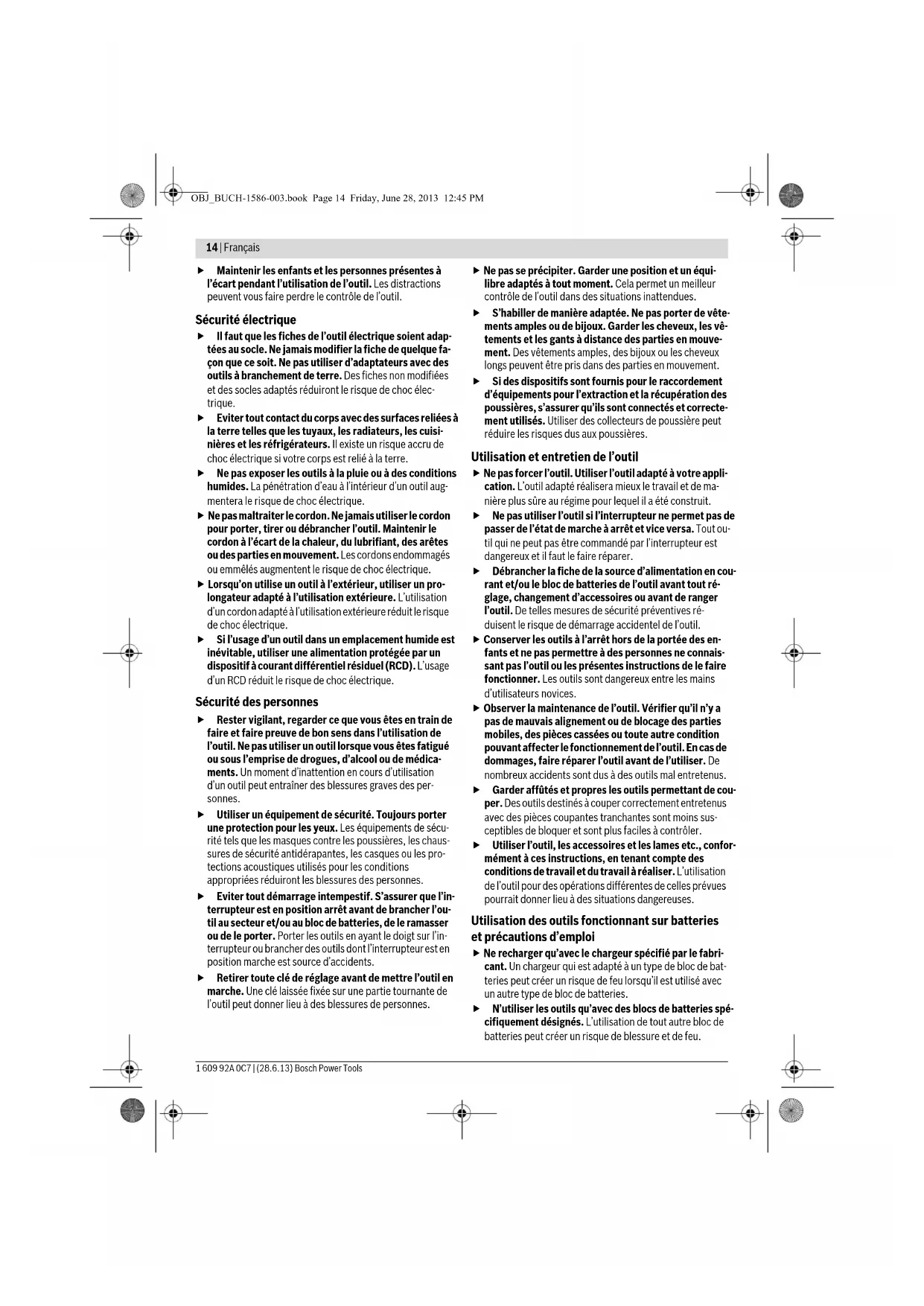 Noise/Vibration Information The measured values of the machine are listed in the table on page 155. Noise and vibrational values (vector sum of three directions) determined according to EN 60745. The vibration emission level given in this information sheet has been measured in accordance with a standardised test given in EN 60745 and may be used to compare one tool with another. It may be used for a preliminary assessment of expo- sure. The declared vibration emission level represents the main ap- plications of the tool. However if the tool is used for different applications, with different accessories or poorly maintained, the vibration emission may differ. This may significantly in- crease the exposure level over the total working period. An estimation of the level of exposure to vibration should also take into account the times when the tool is switched off or when it is running but not actually doing the job. This may sig- nificantly reduce the exposure level over the total working pe- riod. Identify additional safety measures to protect the operator from the effects of vibration such as: maintain the tool and the accessories, keep hands warm, organise work patterns. Mounting and Operation The following table indicates the action objectives for mounting and operation of the power tool. The instructions for each action objective are shown aside. Depending on the type of application, various instruction combinations are required. Observe the safety instructions. Henk Becker Executive Vice President Engineering Helmut Heinzelmann Head of Product Certification PT/ETM9 Action Figure Please observe Page Removing the battery 1 156 Inserting the battery 2 156 OBJ_BUCH-1586-003.book Page 11 Friday, June 28, 2013 12:45 PM12 | English 1 609 92A 0C7 | (28.6.13) Bosch Power Tools Maintenance and Cleaning For safe and proper working, always keep the machine and ventilation slots clean. Clean the application tool, the tool holder, the power tool’s ventilations slots, and the battery’s ventilation slots each time after using. After-sales Service and Application Service Our after-sales service responds to your questions concern- ing maintenance and repair of your product as well as spare parts. Exploded views and information on spare parts can al- so be found under: www.bosch-pt.com Bosch’s application service team will gladly answer questions concerning our products and their accessories. In all correspondence and spare parts order, please always in- clude the 10-digit article number given on the type plate of the machine. Great Britain Robert Bosch Ltd. (B.S.C.) P.O. Box 98 Broadwater Park North Orbital Road Denham Uxbridge UB 9 5HJ Tel. Service: (0844) 7360109 Fax: (0844) 7360146 E-Mail: boschservicecentre@bosch.com Ireland Origo Ltd. Unit 23 Magna Drive Magna Business Park City West Dublin 24 Tel. Service: (01) 4666700 Fax: (01) 4666888 Mounting application tools 3 156 Reversing the rotational direction 4 157 Setting the torque 5 157 Selecting the drilling position 6 158 Gear selection, mechanical 7 158 Switching On and Off 8 158 Selecting Accessories – 159 Action Figure Please observe Page OBJ_BUCH-1586-003.book Page 12 Friday, June 28, 2013 12:45 PMFrançais | 13 Bosch Power Tools 1 609 92A 0C7 | (28.6.13) Australia, New Zealand and Pacific Islands Robert Bosch Australia Pty. Ltd. Power Tools Locked Bag 66 Clayton South VIC 3169 Customer Contact Center Inside Australia: Phone: (01300) 307044 Fax: (01300) 307045 Inside New Zealand: Phone: (0800) 543353 Fax: (0800) 428570 Outside AU and NZ: Phone: +61 3 95415555 www.bosch.com.au Republic of South Africa Customer service Hotline: (011) 6519600 Gauteng – BSC Service Centre 35 Roper Street, New Centre Johannesburg Tel.: (011) 4939375 Fax: (011) 4930126 E-Mail: bsctools@icon.co.za KZN – BSC Service Centre Unit E, Almar Centre 143 Crompton Street Pinetown Tel.: (031) 7012120 Fax: (031) 7012446 E-Mail: bsc.dur@za.bosch.com Western Cape – BSC Service Centre Democracy Way, Prosperity Park Milnerton Tel.: (021) 5512577 Fax: (021) 5513223 E-Mail: bsc@zsd.co.za Bosch Headquarters Midrand, Gauteng Tel.: (011) 6519600 Fax: (011) 6519880 E-Mail: rbsa-hq.pts@za.bosch.com Transport The contained lithium ion batteries are subject to the Danger- ous Goods Legislation requirements. The user can transport the batteries by road without further requirements. When being transported by third parties (e.g.: air transport or forwarding agency), special requirements on packaging and labelling must be observed. For preparation of the item being shipped, consulting an expert for hazardous material is re- quired. Dispatch batteries only when the housing is undamaged. Tape or mask off open contacts and pack up the battery in such a manner that it cannot move around in the packaging. Please also observe possibly more detailed national regula- tions. Disposal The machine, rechargeable batteries, accessories and packaging should be sorted for environmental- friendly recycling. Do not dispose of power tools and batteries/rechargeable batteries into household waste! Only for EC countries: According to the European Guideline 2012/19/EU, power tools that are no long- er usable, and according to the European Guideline 2006/66/EC, defective or used battery packs/batteries, must be collected separately and disposed of in an environ- mentally correct manner. Batteries no longer suitable for use can be directly returned at: Great Britain Robert Bosch Ltd. (B.S.C.) P.O. Box 98 Broadwater Park North Orbital Road Denham Uxbridge UB 9 5HJ Tel. Service: (0844) 7360109 Fax: (0844) 7360146 E-Mail: boschservicecentre@bosch.com Subject to change without notice. Français Avertissements de sécurité généraux pour l’outil Lire tous les avertissements de sécurité et toutes les ins- tructions. Ne pas suivre les avertissements et instructions peut donner lieu à un choc électrique, un incendie et/ou une blessure sérieuse. Conserver tous les avertissements et toutes les instruc- t