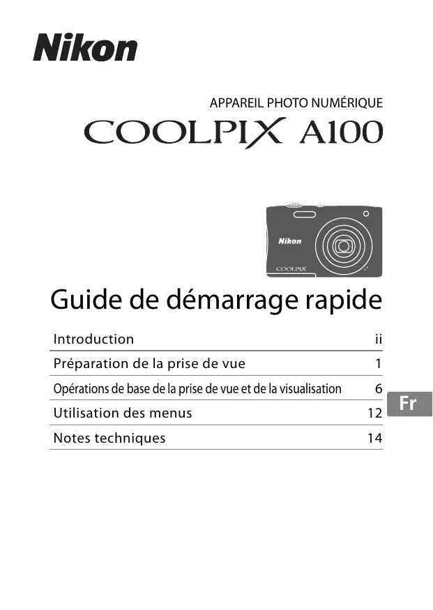 Introduction À lire en premier Pour tirer le meilleur parti de ce produit Nikon, n'oubliez pas de lire intégralement « Pour votre sécurité » (Avii–ix), ainsi que toutes les autres instructions et de les conserver à portée de tous ceux qui utiliseront l'appareil photo. • Si vous souhaitez commencer directement à utiliser l'appareil photo, reportezvous aux sections « Préparation de la prise de vue » (A1) et « Opérations de base de la prise de vue et de la visualisation » (A6).