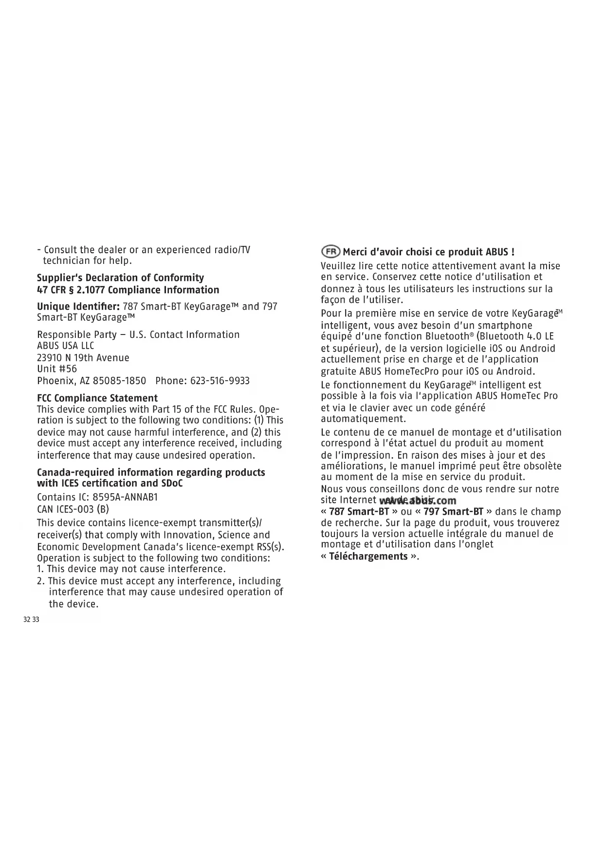 intelligent est possible à la fois via l‘application ABUS HomeTec Pro et via le clavier avec un code généré automatiquement. Le contenu de ce manuel de montage et d’utilisation correspond à l’état actuel du produit au moment de l’impression. En raison des mises à jour et des améliorations, le manuel imprimé peut être obsolète au moment de la mise en service du produit. Nous vous conseillons donc de vous rendre sur notre site Internet et de saisir « 787 Smart-BT » ou « 797 Smart-BT » dans le champ de recherche. Sur la page du produit, vous trouverez toujours la version actuelle intégrale du manuel de montage et d’utilisation dans l’onglet « Téléchargements ». - Consult the dealer or an experienced radio/TV technician for help. Supplier‘s Declaration of Conformity 47 CFR § 2.1077 Compliance Information Unique Identier: 787 Smart-BT KeyGarage™ and 797 Smart-BT KeyGarage™ Responsible Party – U.S. Contact Information