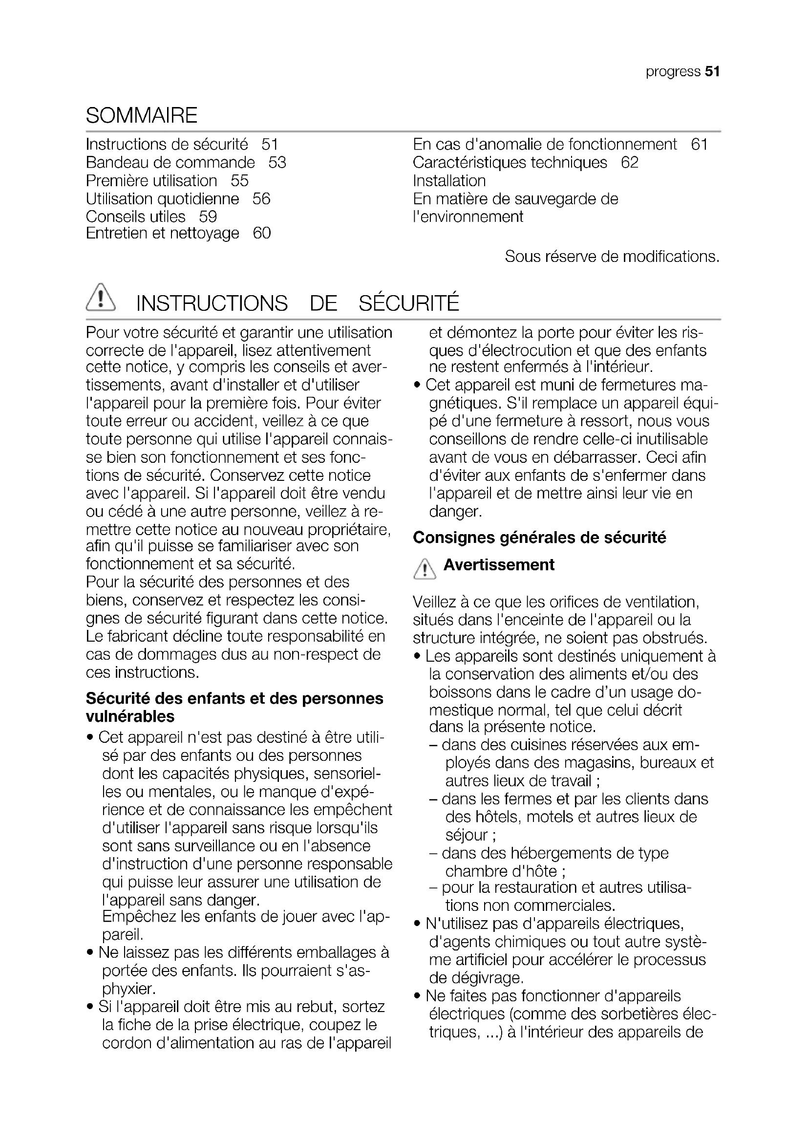 - Ne faites pas fonctionner d'appareils électriques (comme des sorbetières élec- triques, ...) à l'intérieur des appareils de progress 51réfrigération à moins que cette utilisation n'ait reçu l'agrément du fabricant.