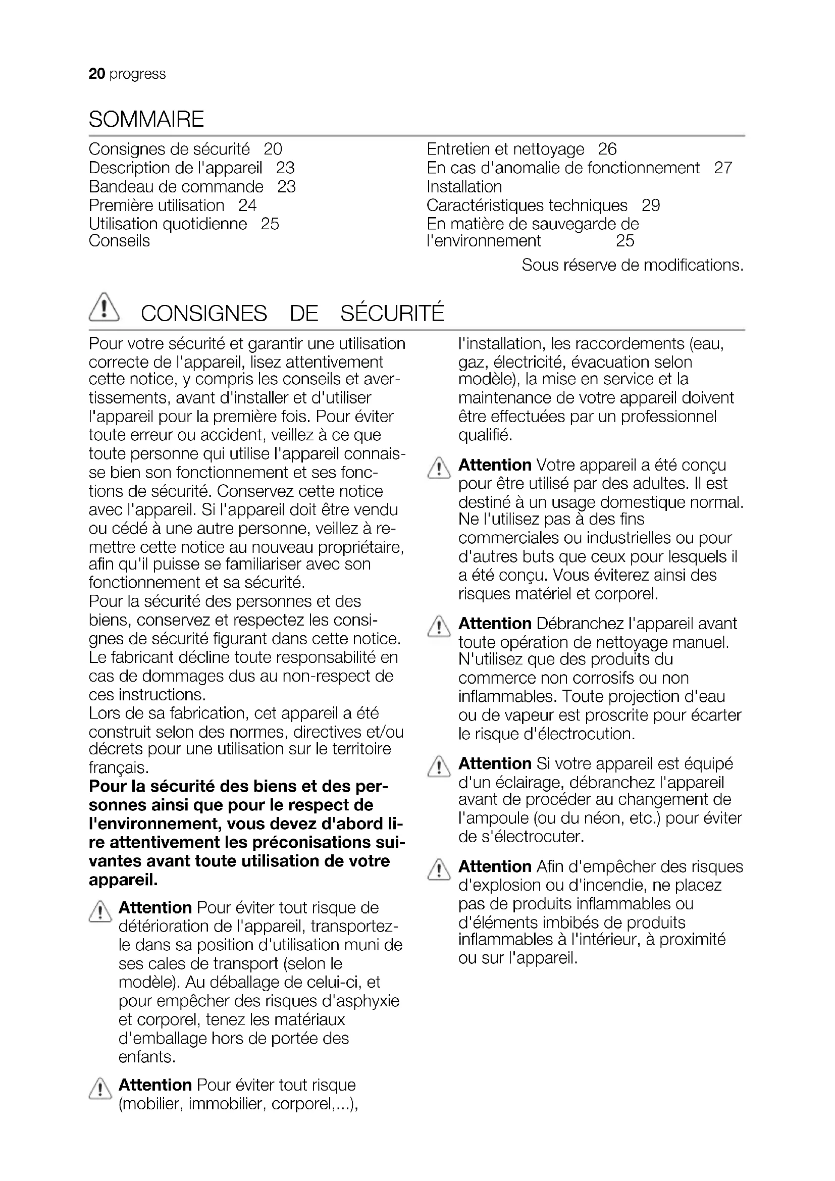 Pour votre sécurité et garantir une utilisation correcte de l'appareil, lisez attentivement cette notice, y compris les conseils et aver- tissements, avant d'installer et d'utiliser l'appareil pour la première fois. Pour éviter toute erreur ou accident, veillez à ce que toute personne qui utilise l'appareil connais- se bien son fonctionnement et ses fonc- tions de sécurité. Conservez cette notice avec l'appareil. Si l'appareil doit être vendu ou cédé à une autre personne, veillez à re- mettre cette notice au nouveau propriétaire, afin qu'il puisse se familiariser avec son fonctionnement et sa sécurité. Pour la sécurité des personnes et des biens, conservez et respectez les consi- gnes de sécurité figurant dans cette notice. Le fabricant décline toute responsabilité en cas de dommages dus au non-respect de ces instructions. Lors de sa fabrication, cet appareil a été construit selon des normes, directives et/ou décrets pour une utilisation sur le territoire français. Pour la sécurité des biens et des per- sonnes ainsi que pour le respect de l'environnement, vous devez d'abord li- re attentivement les préconisations sui- vantes avant toute utilisation de votre appareil. Attention Pour éviter tout risque de détérioration de l'appareil, transportez- le dans sa position d'utilisation muni de ses cales de transport (selon le modèle). Au déballage de celui-ci, et pour empêcher des risques d'asphyxie et corporel, tenez les matériaux d'emballage hors de portée des enfants. Attention Pour éviter tout risque (mobilier, immobilier, corporel,...), l'installation, les raccordements (eau, gaz, électricité, évacuation selon modèle), la mise en service et la maintenance de votre appareil doivent être effectuées par un professionnel qualifié. Attention Votre appareil a été conçu pour être utilisé par des adultes. Il est destiné à un usage domestique normal. Ne l'utilisez pas à des fins commerciales ou industrielles ou pour d'autres buts que ceux pour lesquels il a été conçu. Vous éviterez ainsi des risques matériel et corporel. Attention Débranchez l'appareil avant toute opération de nettoyage manuel. N'utilisez que des produits du commerce non corrosifs ou non inflammables. Toute projection d'eau ou de vapeur est proscrite pour écarter le risque d'électrocution. Attention Si votre appareil est équipé d'un éclairage, débranchez l'appareil avant de procéder au changement de l'ampoule (ou du néon, etc.) pour éviter de s'électrocuter. Attention Afin d'empêcher des risques d'explosion ou d'incendie, ne placez pas de produits inflammables ou d'éléments imbibés de produits inflammables à l'intérieur, à proximité ou sur l'appareil. 20 progressAttention Lors de la mise au rebut de votre appareil, et pour écarter tout risque corporel, mettez hors d'usage ce qui pourrait présenter un danger : coupez le câble d'alimentation au ras de l'appareil. Informez-vous auprès des services de votre commune des endroits autorisés pour la mise au rebut de l'appareil. Attention Respectez la chaîne de froid dès l'acquisition d'un aliment jusqu'à sa consommation pour exclure le risque d'intoxication alimentaire. Veuillez maintenant lire attentive- ment cette notice pour une utilisa- tion optimale de votre appareil. Sécurité des enfants et des personnes vulnérables