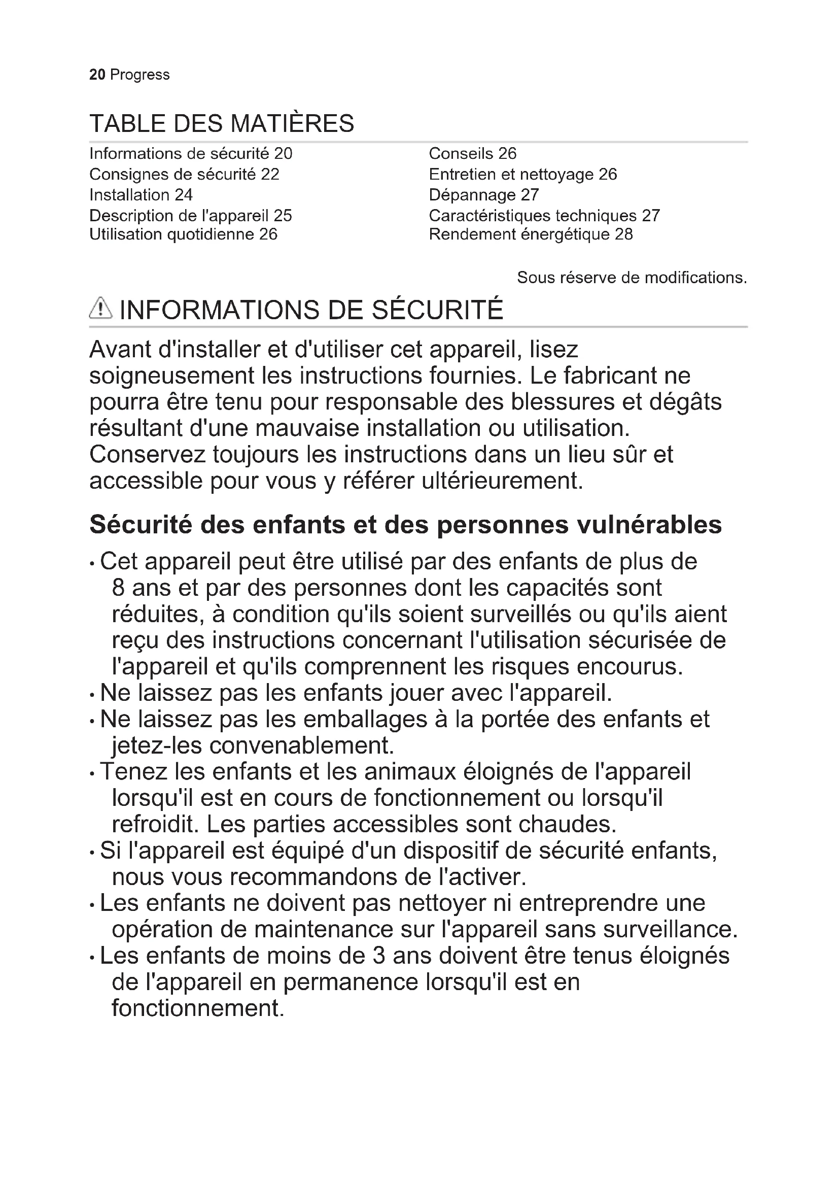 Informations de sécurité 20 Consignes de sécurité 22 Installation 24 Description de l'appareil 25 Utilisation quotidienne 26