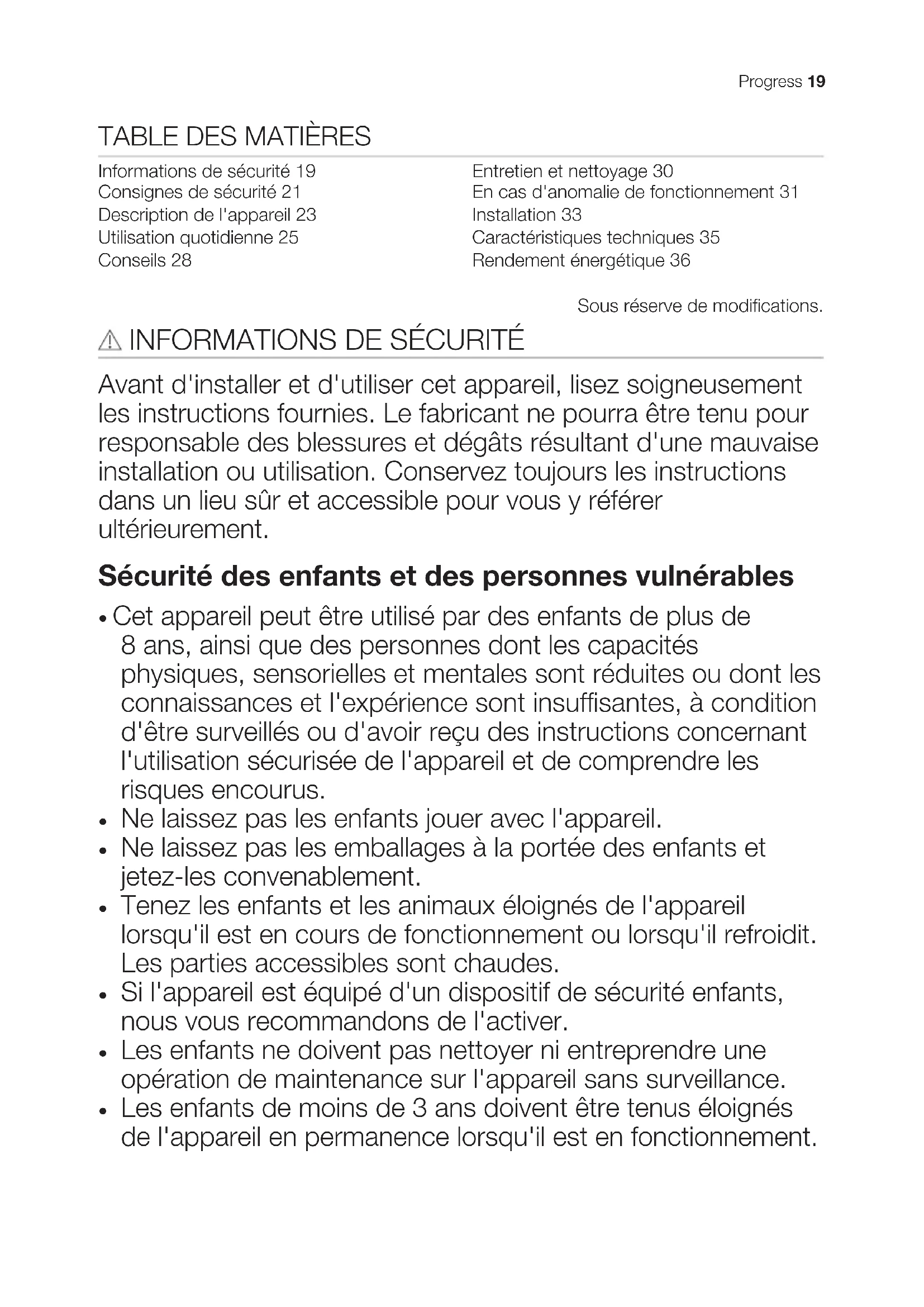 Les enfants de moins de 3 ans doivent être tenus éloignés de l'appareil en permanence lorsqu'il est en fonctionnement. Progress 19Sécurité générale