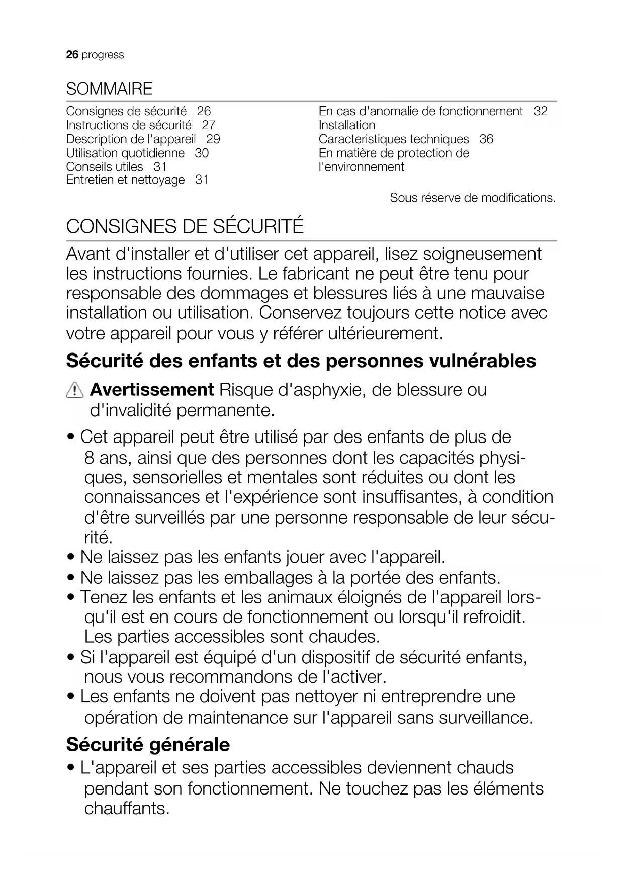 - Assurez-vous que l'appareil est bien in- stallé. Un câble d'alimentation lâche et in- approprié ou une fiche (si présente) non serrée peuvent être à l'origine d'une sur- chauffe des bornes. progress 27•Assurez-vous qu'une protection anti- électrocution est installée.