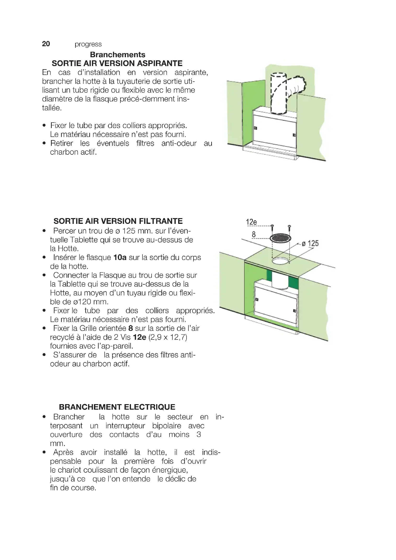 - Pourlenettoyagedessurfacesdelahotte,ilsuftd’uti- liserunchiffonhumideetdétersifliquideneutre. Lesymbole sur le produitousonemballage indique que ceproduitnepeutêtretraitécommedéchetménager.Ildoitplu- tôtêtreremisaupointderamassageconcerné,sechargeantdu recyclagedumatérielélectriqueetélectronique.Envousassurant queceproduitestéliminécorrectement,vousfavorisezlapréven- tiondesconséquencesnégativespourl’environnementetlasanté humaine qui, sinon, seraient le résultat d’un traitement inappro- priédesdéchetsdeceproduit.Pourobtenirplusdedétailssurle recyclagedeceproduit,veuillezprendrecontactavecle bureau municipaldevotrerégion,votreserviced’éliminationdesdéchets ménagersoulemagasinoùvousavezachetéleproduit.18 progress CARACTERISTIqUES Encombrement Composants Ref. Qtè. Product Components 1 1 CorpsHotteéquipéde:Com- mandes,Lumière,GroupeVenti- lateur, Filtres 8 1 GrilleorientéeSortiedel’Air 10a1 Flasqueø120mm 20 1 Prolfermeture Ref. Qtè. Installation Components 12a4 Vis3,5x16 12e2 Vis2,9x12,7 12f 3 Vis2,9x9,5 Qtè. Documentation 1 Manueld’instructions
