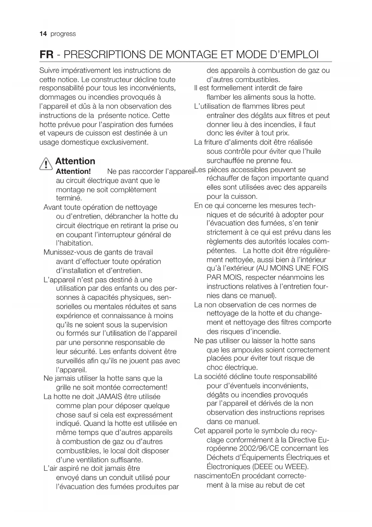 basic cleaning recommendations of the cooker hood and replacement of the filters may cause fire risks. Therefore, we recommend observing these instructions. The manufacturer declines all responsibility for any damage to the motor or any fi re damage linked to inappropriate maintenance or failure to observe the above safety recommendations. Grease fi lter Fig. 1-17 The grease fi lter must be cleaned once a month using non aggressive detergents, either by hand or in the dishwasher, which must be set to a low temperature and a short cycle. When washed in a dishwasher, the grease fi lter may discolour slightly, but this does not affect its fi ltering capacity. Charcoal fi lter (fi lter version only) Fig. 16 Type 20 LONG LIFE - Washable activated charcoal fi lter The charcoal fi lter can be washed once every two months using hot water and a suitable detergent, or in a dishwasher at 65°C (if the dishwasher is used, select the full cycle function and leave dishes out). Eliminate excess water without damaging the fi lter, then remove the mattress located inside the plastic frame and put it in the oven for 10 minutes at 100° C to dry completely. Replace the mattress every 3 years and when the cloth is damaged. Type 15 - NON-washable activated charcoal fi lter The saturation of the charcoal fi lter occurs after more or less prolonged use, depending on the type of cooking and the regularity of cleaning of the grease fi lter. In any case it is necessary to replace the cartridge at least every four mounths. The charcoal fi lter may NOT be washed or regenerated. Replacing lamps Fig. 18 Disconnect the hood from the electricity. Warning! Prior to touching the light bulbs ensure they are cooled down. Replace with a new 12 Volt, 20 Watt (Maximum) halogen light made for a G-4 base SUITABLE FOR USE IN OPEN LUMINAIRES. Follow package directions and do not touch new light with bare hands.14 progress FR - PRESCRIPTIONS DE MONTAGE ET MODE D’EMPLOI Suivre impérativement les instructions de cette notice. Le constructeur décline toute responsabilité pour tous les inconvénients, dommages ou incendies provoqués à l’appareil et dûs à la non observation des instructions de la présente notice. Cette hotte prévue pour l’aspiration des fumées et vapeurs de cuisson est destinée à un usage domestique exclusivement. Attention Attention! Ne pas raccorder l’appareil au circuit électrique avant que le montage ne soit complètement terminé. Avant toute opération de nettoyage ou d’entretien, débrancher la hotte du circuit électrique en retirant la prise ou en coupant l’interrupteur général de l’habitation. Munissez-vous de gants de travail avant d’effectuer toute opération d’installation et d’entretien. L’appareil n’est pas destiné à une utilisation par des enfants ou des per- sonnes à capacités physiques, sen- sorielles ou mentales réduites et sans expérience et connaissance à moins qu’ils ne soient sous la supervision ou formés sur l’utilisation de l’appareil par une personne responsable de leur sécurité. Les enfants doivent être surveillés afin qu’ils ne jouent pas avec l’appareil. Ne jamais utiliser la hotte sans que la grille ne soit montée correctement! La hotte ne doit JAMAIS être utilisée comme plan pour déposer quelque chose sauf si cela est expressément indiqué. Quand la hotte est utilisée en même temps que d’autres appareils à combustion de gaz ou d’autres combustibles, le local doit disposer d’une ventilation suffisante. L’air aspiré ne doit jamais être envoyé dans un conduit utilisé pour l’évacuation des fumées produites par des appareils à combustion de gaz ou d’autres combustibles. Il est formellement interdit de faire flamber les aliments sous la hotte. L’utilisation de flammes libres peut entraîner des dégâts aux filtres et peut donner lieu à des incendies, il faut donc les éviter à tout prix. La friture d’aliments doit être réalisée sous contrôle pour éviter que l’huile surchauffée ne prenne feu. Les pièces accessibles peuvent se réchauffer de façon importante quand elles sont utilisées avec des appareils pour la cuisson. En ce qui concerne les mesures tech- niques et de sécurité à adopter pour l’évacuation des fumées, s’en tenir strictement à ce qui est prévu dans les règlements des autorités locales com- pétentes. La hotte doit être régulière- ment nettoyée, aussi bien à l’intérieur qu’à l’extérieur (AU MOINS UNE FOIS PAR MOIS, respecter néanmoins les instructions relatives à l’entretien four- nies dans ce manuel). La non observation de ces normes de nettoyage de la hotte et du change- ment et nettoyage des filtres comporte des risques d’incendie. Ne pas utiliser ou laisser la hotte sans que les ampoules soient correctement placées pour éviter tout risque de choc électrique. La société décline toute responsabilité pour d’éventuels inconvénients, dégâts ou incendies provoqués par l’appareil et dérivés de la non observation des instructions reprises dans ce manuel. Cet appareil porte le symbole du recy- clage conformément à la Directive Eu- ropéenne 2002/96/CE concernant les Déchets d’Équipements Électriques et Électroniques (DEEE ou WEEE). nascimentoEn procédant correcte- ment à la mise au rebut de cetprogress 15 appareil, vous contribuerez à em- pêcher toute conséquence nuisible pour l’environnement et la santé de l’homme. Le symbole présent sur l’appareil ou sur la documentation qui l’accompagne indique que ce produit ne peut en aucun cas être traité comme déchet ménager. Il doit par conséquent être remis à un centre de collecte des déchets chargé du recy- clage des équipements électriques et électroniques. Pour la mise au rebut, respectez les normes relatives à l’élimination des déchets en vigueur dans le pays d’installation. Pour obtenir de plus amples détails au sujet du traitement, de la récu