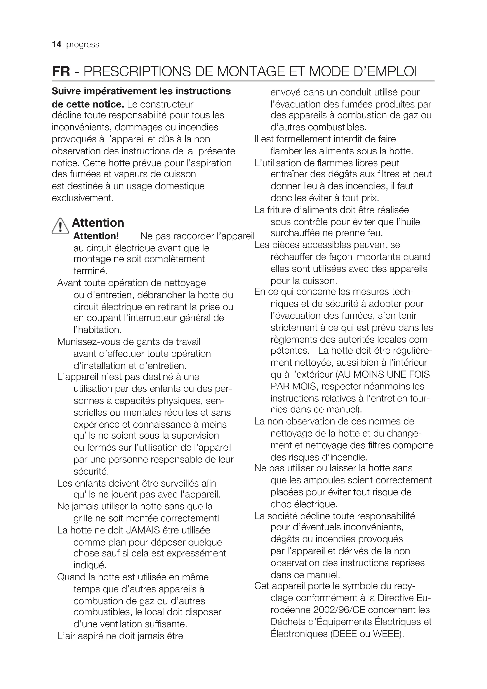 basic cleaning recommendations of the cooker hood and replacement of the filters may cause fire risks. Therefore, we recommend observing these instructions. The manufacturer declines all responsibility for any damage to the motor or any fi re damage linked to inappropriate maintenance or failure to observe the above safety recommendations. Grease fi lter Fig. 1-16 This must be cleaned once a month (or when the fi lter saturation indication system – if envisaged on the model in possession – indicates this necessity) using non aggressive detergents, either by hand or in the dishwasher, which must be set to a low temperature and a short cycle. When washed in a dishwasher, the grease fi lter may discolour slightly, but this does not affect its fi ltering capacity. Charcoal fi lter (fi lter version only) Fig. 15 Charcoal fi lter - Type 20 LONG LIFE - Washable activated charcoal fi lter The charcoal fi lter can be washed once every two months using hot water and a suitable detergent, or in a dishwasher at 65°C (if the dishwasher is used, select the full cycle function and leave dishes out). Eliminate excess water without damaging the fi lter, then remove the mattress located inside the plastic frame and put it in the oven for 10 minutes at 100° C to dry completely. Replace the mattress every 3 years and when the cloth is damaged. Type 15 - NON-washable activated charcoal fi lter The saturation of the charcoal fi lter occurs after more or less prolonged use, depending on the type of cooking and the regularity of cleaning of the grease fi lter. In any case it is necessary to replace the cartridge at least every four mounths. The charcoal fi lter may NOT be washed or regenerated. Replacing lamps Disconnect the hood from the electricity. Warning! Prior to touching the light bulbs ensure they are cooled down. Use Ø35mm E14 28W halogen candle lamps only.14 progress FR - PRESCRIPTIONS DE MONTAGE ET MODE D’EMPLOI Suivre impérativement les instructions de cette notice. Le constructeur décline toute responsabilité pour tous les inconvénients, dommages ou incendies provoqués à l’appareil et dûs à la non observation des instructions de la présente notice. Cette hotte prévue pour l’aspiration des fumées et vapeurs de cuisson est destinée à un usage domestique exclusivement. Attention Attention! Ne pas raccorder l’appareil au circuit électrique avant que le montage ne soit complètement terminé. Avant toute opération de nettoyage ou d’entretien, débrancher la hotte du circuit électrique en retirant la prise ou en coupant l’interrupteur général de l’habitation. Munissez-vous de gants de travail avant d’effectuer toute opération d’installation et d’entretien. L’appareil n’est pas destiné à une utilisation par des enfants ou des per- sonnes à capacités physiques, sen- sorielles ou mentales réduites et sans expérience et connaissance à moins qu’ils ne soient sous la supervision ou formés sur l’utilisation de l’appareil par une personne responsable de leur sécurité. Les enfants doivent être surveillés afin qu’ils ne jouent pas avec l’appareil. Ne jamais utiliser la hotte sans que la grille ne soit montée correctement! La hotte ne doit JAMAIS être utilisée comme plan pour déposer quelque chose sauf si cela est expressément indiqué. Quand la hotte est utilisée en même temps que d’autres appareils à combustion de gaz ou d’autres combustibles, le local doit disposer d’une ventilation suffisante. L’air aspiré ne doit jamais être envoyé dans un conduit utilisé pour l’évacuation des fumées produites par des appareils à combustion de gaz ou d’autres combustibles. Il est formellement interdit de faire flamber les aliments sous la hotte. L’utilisation de flammes libres peut entraîner des dégâts aux filtres et peut donner lieu à des incendies, il faut donc les éviter à tout prix. La friture d’aliments doit être réalisée sous contrôle pour éviter que l’huile surchauffée ne prenne feu. Les pièces accessibles peuvent se réchauffer de façon importante quand elles sont utilisées avec des appareils pour la cuisson. En ce qui concerne les mesures tech- niques et de sécurité à adopter pour l’évacuation des fumées, s’en tenir strictement à ce qui est prévu dans les règlements des autorités locales com- pétentes. La hotte doit être régulière- ment nettoyée, aussi bien à l’intérieur qu’à l’extérieur (AU MOINS UNE FOIS PAR MOIS, respecter néanmoins les instructions relatives à l’entretien four- nies dans ce manuel). La non observation de ces normes de nettoyage de la hotte et du change- ment et nettoyage des filtres comporte des risques d’incendie. Ne pas utiliser ou laisser la hotte sans que les ampoules soient correctement placées pour éviter tout risque de choc électrique. La société décline toute responsabilité pour d’éventuels inconvénients, dégâts ou incendies provoqués par l’appareil et dérivés de la non observation des instructions reprises dans ce manuel. Cet appareil porte le symbole du recy- clage conformément à la Directive Eu- ropéenne 2002/96/CE concernant les Déchets d’Équipements Électriques et Électroniques (DEEE ou WEEE).progress 15 nascimentoEn procédant correcte- ment à la mise au rebut de cet appareil, vous contribuerez à em- pêcher toute conséquence nuisible pour l’environnement et la santé de l’homme. Le symbole présent sur l’appareil ou sur la documentation qui l’accompagne indique que ce produit ne peut en aucun cas être traité comme déchet ménager. Il doit par conséquent être remis à un centre de collecte des déchets chargé du recy- clage des équipements électriques et électroniques. Pour la mise au rebut, respectez les normes relatives à l’élimination des déchets en vigueur dans le pays d’installation. Pour obtenir de plus amples détails au sujet du traitement, de la récupération et du recy