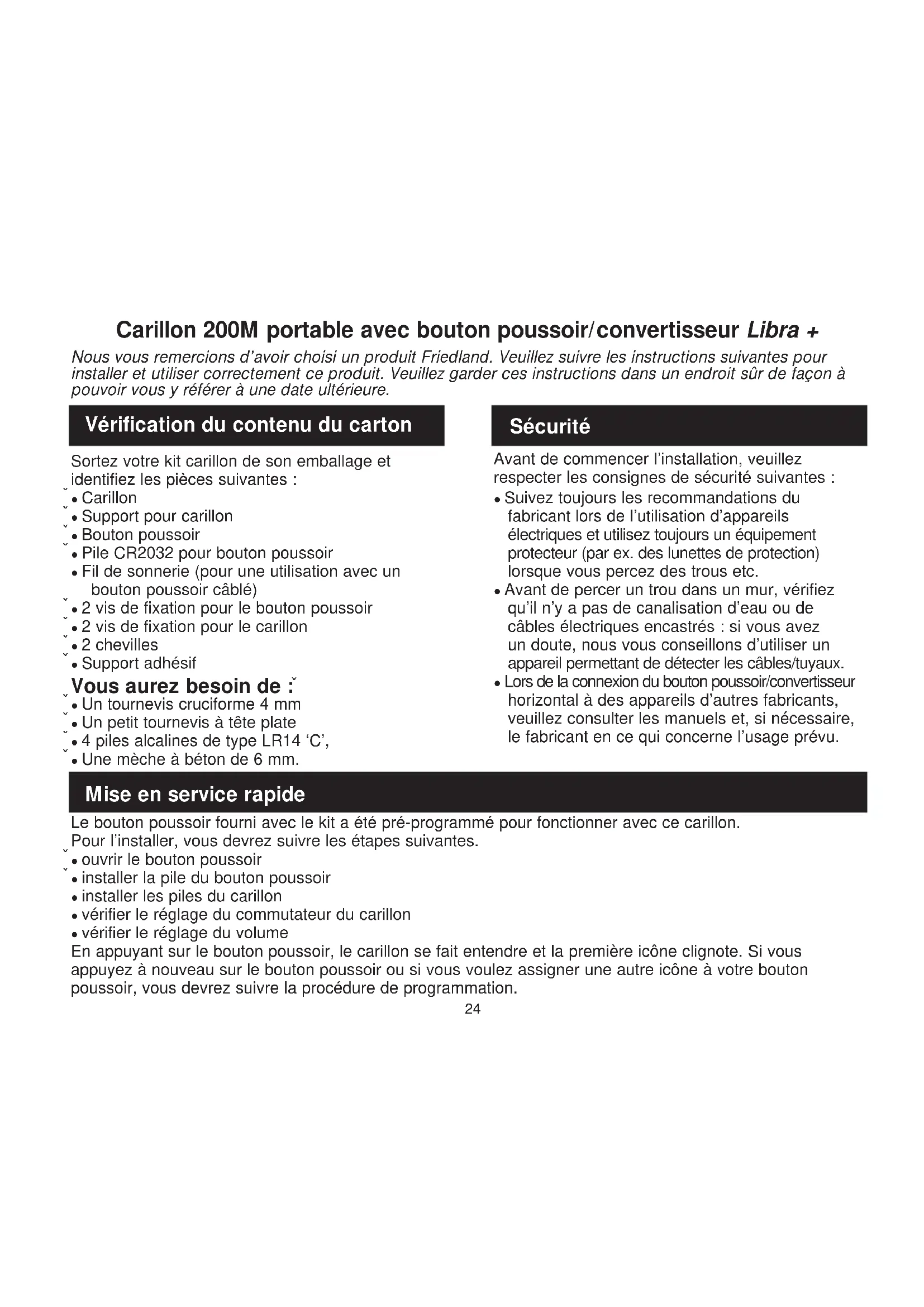 FRANÇAIS Vérification du contenu du carton....................... Pg. 24 Sécurité............................................................... Mise en service rapide.................................. Ouvrir le bouton poussoir/retirer l'étiquette......... Pg. 25 Installation de la pile du bouton pousoir.............. Installation des piles du carillon.......................... Fonctions Carillon............................................... Pg. 26 Positions du commutateur .................................. Réglage du volume ............................................ Fenêtre coulissante ........................................... Utilisation des icônes ......................................... Pg. 27 Procédure de programmation ............................ Fonction Rappel .................................................Pg. 28 Sonneries du carillon........................................... Montage du bouton poussoir............................... Position du carillon.............................................. Fonctions bouton poussoir/convertisseur............Pg. 29 Connexions types .............................................. Pg. 30 Résolution des problèmes...................................Pg. 31 Spécifications...................................................... Pg. 32 Mise au rebut et recyclage.................................. Garantie............................................................... Déclaration..........................................................Carillon 200M portable avec bouton poussoir/convertisseur Libra + Nous vous remercions d’avoir choisi un produit Friedland. Veuillez suivre les instructions suivantes pour installer et utiliser correctement ce produit. Veuillez garder ces instructions dans un endroit sûr de façon à pouvoir vous y référer à une date ultérieure. Sortez votre kit carillon de son emballage et identifiez les pièces suivantes : ¬● Carillon ¬● Support pour carillon ¬● Bouton poussoir ¬● Pile CR2032 pour bouton poussoir ● Fil de sonnerie (pour une utilisation avec un bouton poussoir câblé) ¬● 2 vis de fixation pour le bouton poussoir ¬● 2 vis de fixation pour le carillon ¬● 2 chevilles ¬● Support adhésif Vous aurez besoin de : ¬ ¬● Un tournevis cruciforme 4 mm ¬● Un petit tournevis à tête plate ¬● 4 piles alcalines de type LR14 ‘C’, ¬● Une mèche à béton de 6 mm. Vérification du contenu du carton Avant de commencer l’installation, veuillez respecter les consignes de sécurité suivantes : ● Suivez toujours les recommandations du fabricant lors de l’utilisation d’appareils électriques et utilisez toujours un équipement protecteur (par ex. des lunettes de protection) lorsque vous percez des trous etc. ● Avant de percer un trou dans un mur, vérifiez qu’il n’y a pas de canalisation d’eau ou de câbles électriques encastrés : si vous avez un doute, nous vous conseillons d’utiliser un appareil permettant de détecter les câbles/tuyaux. ● Lors de la connexion du bouton poussoir/convertisseur horizontal à des appareils d’autres fabricants, veuillez consulter les manuels et, si nécessaire, le fabricant en ce qui concerne l’usage prévu. Sécurité Le bouton poussoir fourni avec le kit a été pré-programmé pour fonctionner avec ce carillon. Pour l’installer, vous devrez suivre les étapes suivantes. ¬● ouvrir le bouton poussoir ¬● installer la pile du bouton poussoir ● installer les piles du carillon ● vérifier le réglage du commutateur du carillon ● vérifier le réglage du volume En appuyant sur le bouton poussoir, le carillon se fait entendre et la première icône clignote. Si vous appuyez à nouveau sur le bouton poussoir ou si vous voulez assigner une autre icône à votre bouton poussoir, vous devrez suivre la procédure de programmation. Mise en service rapide