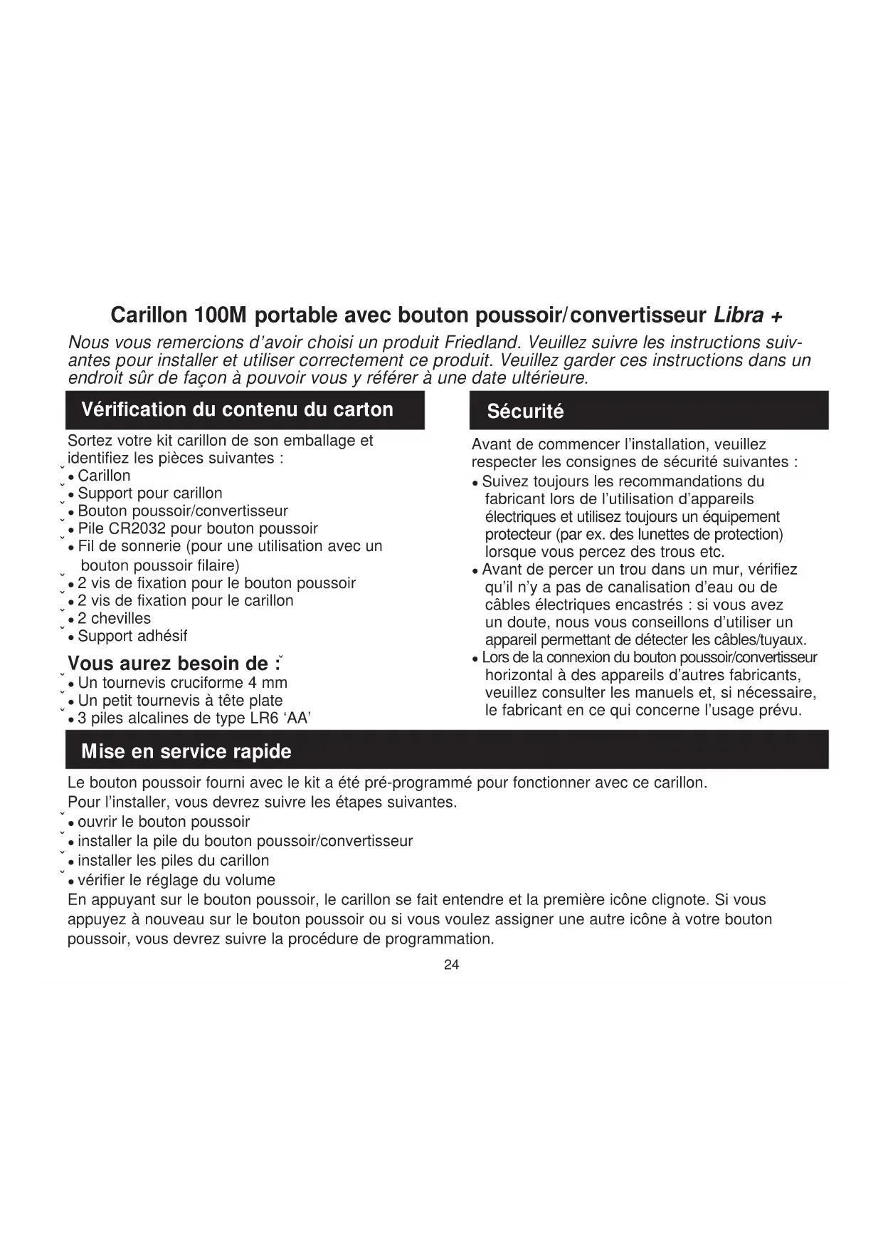 Connexions types31 J’entends un ‘ bip’ sonore en mode apprentissage… ● Le bouton poussoir que vous programmez a déjà été configuré avec ce carillon. ● Si vous voulez changer l’icône associée au bouton poussoir, utilisez la procédure de désapprentissage, puis programmez à nouveau le bouton poussoir. Deux ‘bips’ retentissent après le carillon normal… ● Cela signifie que la pile du bouton poussoir ayant activé le carillon est bientôt déchargée. Installez une nouvelle pile de type CR2032. Lorsque le bouton poussoir est utilisé, la lumière orange de vérification ne s’allume pas ou ne s’allume que pendant un court moment... ● Pour une utilisation normale, la lumière orange s’allume pendant 1 seconde. Lorsque la pile est presque déchargée, la lumière s’allume pendant un court moment. Installez une nouvelle pile de type CR2032. Le carillon ne fonctionne pas… ● Vérifiez que les piles sont bien des piles de type LR6 'AA'. N’utilisez que des piles alcalines. ● Vérifiez que les piles sont montées correctement. ● Il est possible que le carillon soit hors de portée du bouton poussoir. Essayez le carillon à un autre emplacement. ● Le carillon n’a peut-être pas enregistré l’identité du bouton poussoir. Suivez la procédure de programmation. Le carillon ne sonne pas… ● Vérifiez que le contrôle du volume n’est pas réglé au minimum. Résolution des problèmes32 La portée est réduite… ● Les structures métalliques, notamment les cadres de fenêtres et de porte en PVC-U, peuvent réduire la portée du produit. Evitez de monter le bouton poussoir ou le carillon sur ou à proximité de structures métalliques. ● D’autres équipements engendrent des interférences radio qui risquent d’affecter votre carillon. ● Les murs et les plafonds réduisent la portée de l’appareil. ● La portée est également réduite avec des piles déchargées. Remplacez-les tous les 12 à 18 mois. Dans des conditions climatiques froides (en dessous de +5°C), les piles auront besoin d’être remplacées plus fréquemment. La lumière orange clignote… ● Lorsque la pile du carillon est bientôt déchargée, une lumière orange clignote toutes les 5 secondes. Installez de nouvelles piles de type LR6 ‘AA’ dans le carillon. N’utilisez que des piles alcalines. Lorsque la fonction convertisseur bouton poussoir est utilisée, le carillon ne fonctionne pas… ● Vérifiez que le câblage du bouton poussoir a été effectué correctement. ● Vérifiez que les bons terminaux ont été utilisés et que les vis ont été resserrées. Le bouton poussoir/convertisseur ne fonctionne pas avec mon ancien appareil Libra… ● Libra + n’est pas compatible avec le système Libra antérieur. ● N’utilisez que des accessoires indiquant Libra +.33 Friedland, The Arnold Centre, Paycocke Road, Basildon, Essex, SS14 3EA www.friedland.co.uk Friedland garantit ce produit pour une durée de 2 ans à partir de la date d’achat. Une preuve d’achat est requise ; vos droits en tant que consommateur ne sont pas affectés. Si vous désirez obtenir d’autres informations sur notre produit, veuillez appeler Friedland au