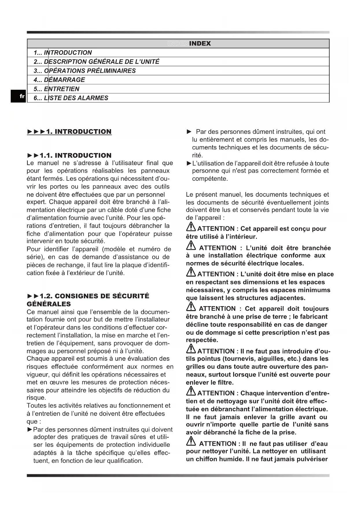 ►►►1. INTRODUCTION ►►1.1. INTRODUCTION Le manuel ne s’adresse à l’utilisateur nal que pour les opérations réalisables les panneaux étant fermés. Les opérations qui nécessitent d’ou- vrir les portes ou les panneaux avec des outils ne doivent être eectuées que par un personnel expert. Chaque appareil doit être branché à l’ali- mentation électrique par un câble doté d’une che d’alimentation fournie avec l’unité. Pour les opé- rations d’entretien, il faut toujours débrancher la che d’alimentation pour que l’opérateur puisse intervenir en toute sécurité. Pour identier l’appareil (modèle et numéro de série), en cas de demande d’assistance ou de pièces de rechange, il faut lire la plaque d’identi- cation xée à l’extérieur de l’unité.